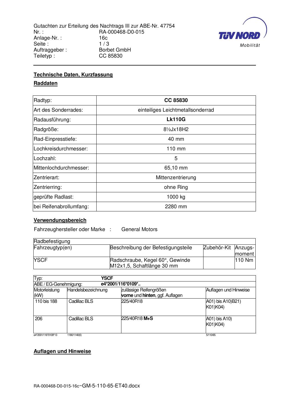 Dieses Gutachten (abe) bezieht sich auf die Alufelge brand-borbet CC 85830 in der Ausführung ET 0, Mittenloch 0 mm (KBA 47754). Im PDF findest du typischerweise zulässige Reifengrößen, Auflagen/Anbauhinweise und – je nach Dokument – Hinweise zur Eintragung.