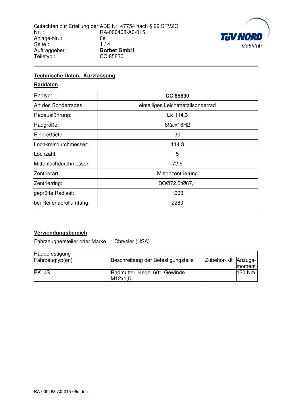 Dieses Gutachten (abe) bezieht sich auf die Alufelge brand-borbet CC 85830 in der Ausführung ET 0, Mittenloch 0 mm (KBA 47754). Im PDF findest du typischerweise zulässige Reifengrößen, Auflagen/Anbauhinweise und – je nach Dokument – Hinweise zur Eintragung.
