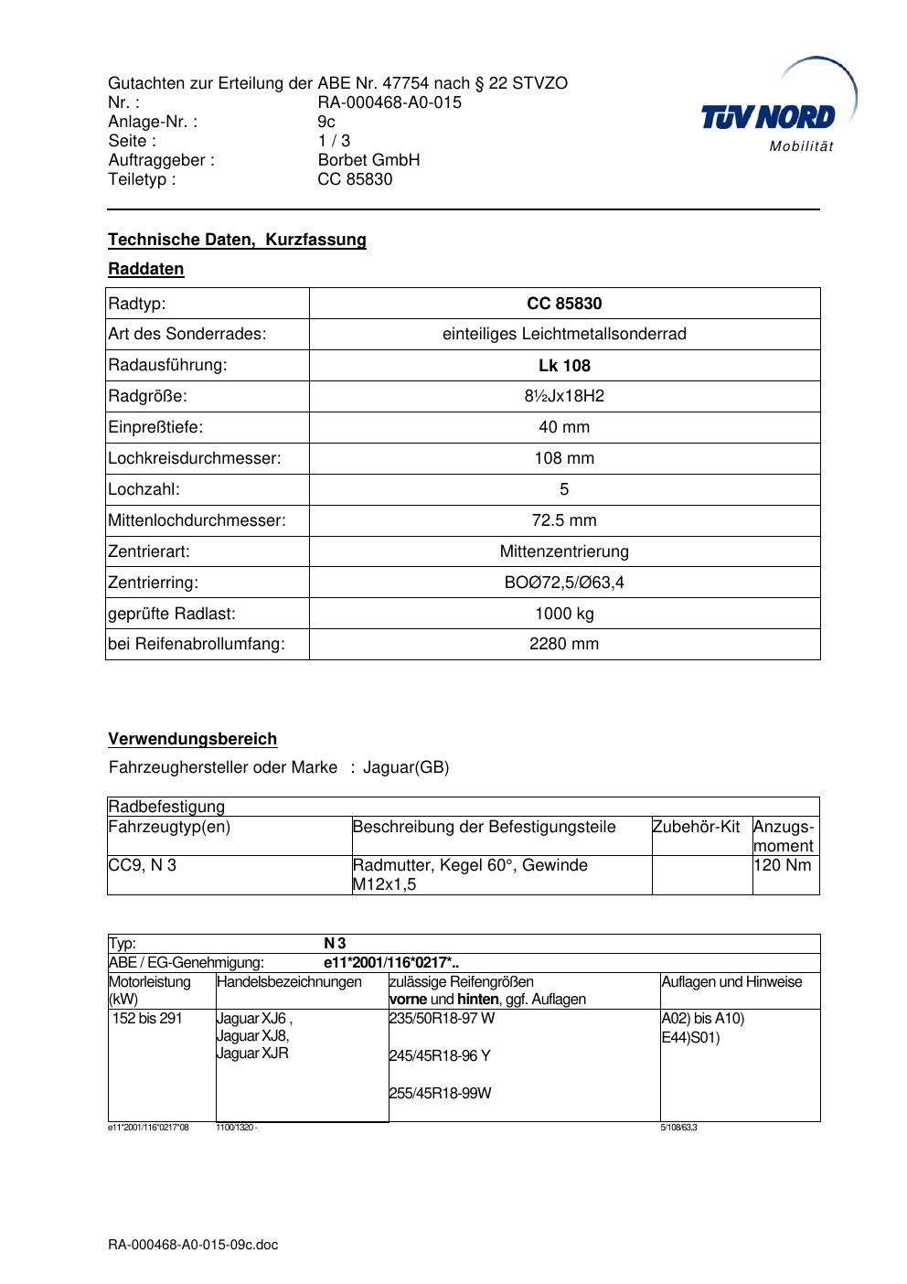 Dieses Gutachten (abe) bezieht sich auf die Alufelge brand-borbet CC 85830 in der Ausführung ET 0, Mittenloch 0 mm (KBA 47754). Im PDF findest du typischerweise zulässige Reifengrößen, Auflagen/Anbauhinweise und – je nach Dokument – Hinweise zur Eintragung.