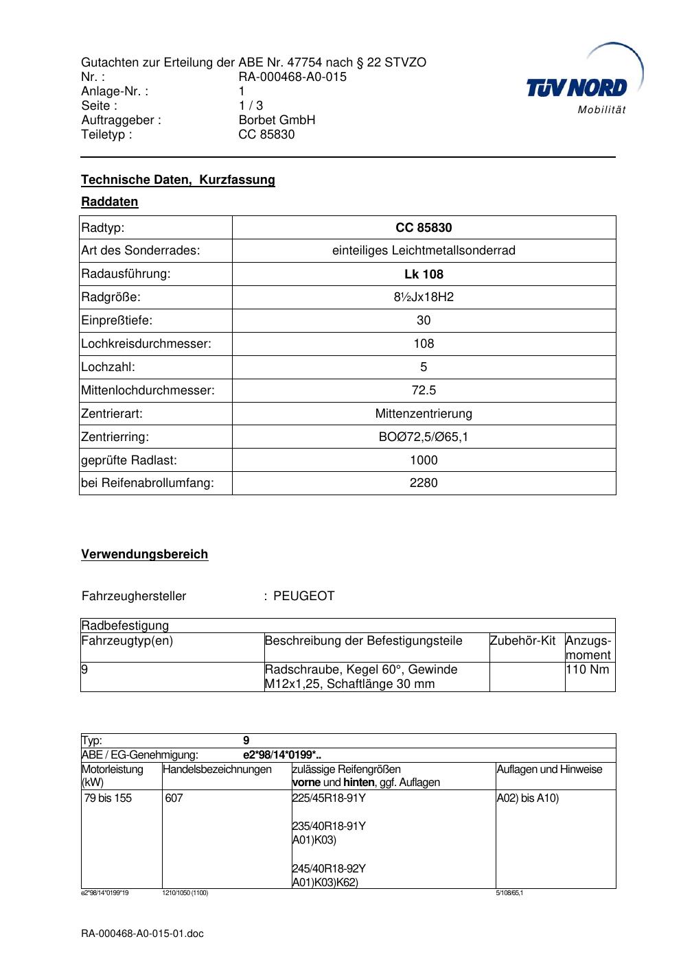 Dieses Gutachten (abe) bezieht sich auf die Alufelge brand-borbet CC 85830 in der Ausführung ET 0, Mittenloch 0 mm (KBA 47754). Im PDF findest du typischerweise zulässige Reifengrößen, Auflagen/Anbauhinweise und – je nach Dokument – Hinweise zur Eintragung.