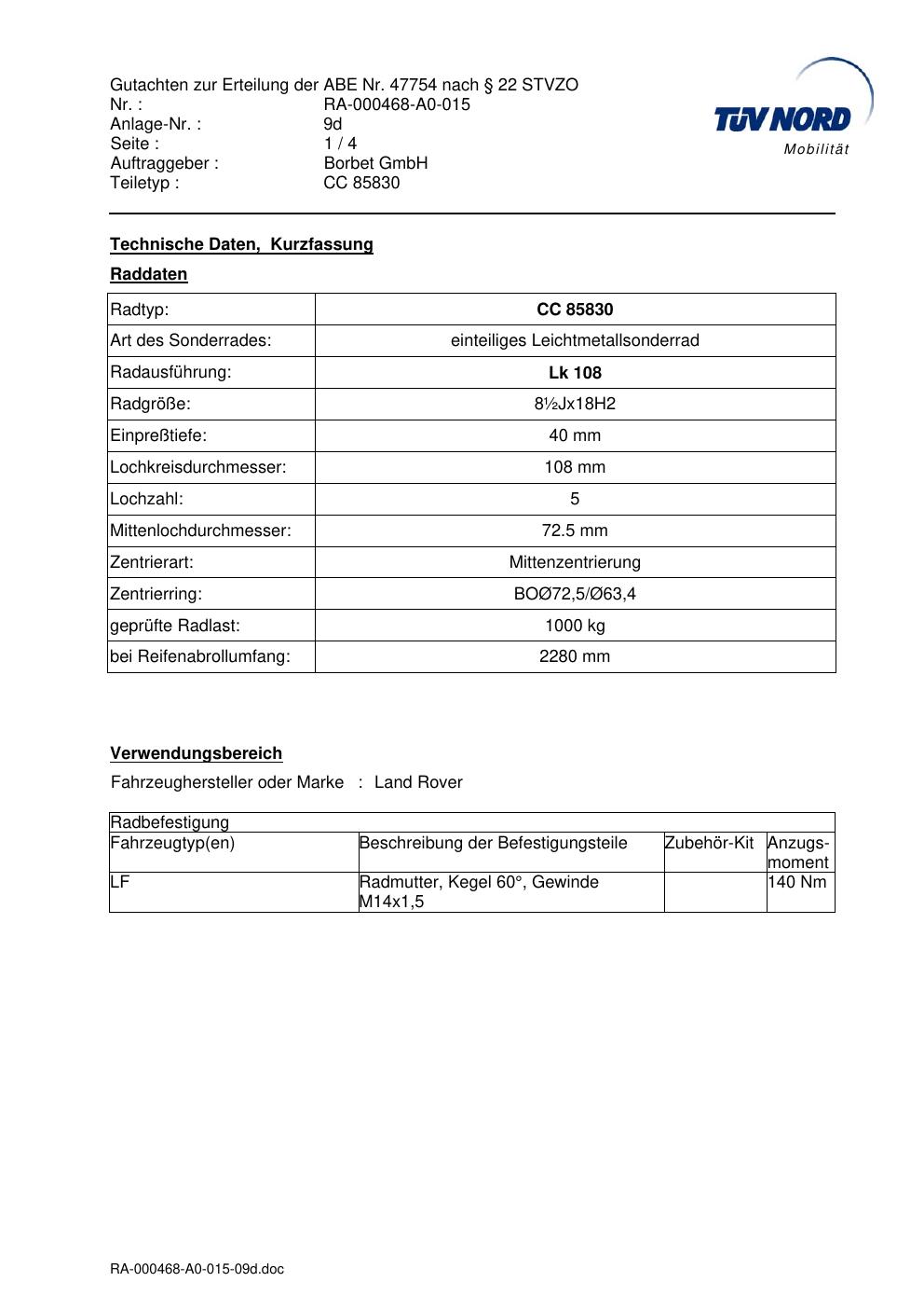 Dieses Gutachten (abe) bezieht sich auf die Alufelge brand-borbet CC 85830 in der Ausführung ET 0, Mittenloch 0 mm (KBA 47754). Im PDF findest du typischerweise zulässige Reifengrößen, Auflagen/Anbauhinweise und – je nach Dokument – Hinweise zur Eintragung.