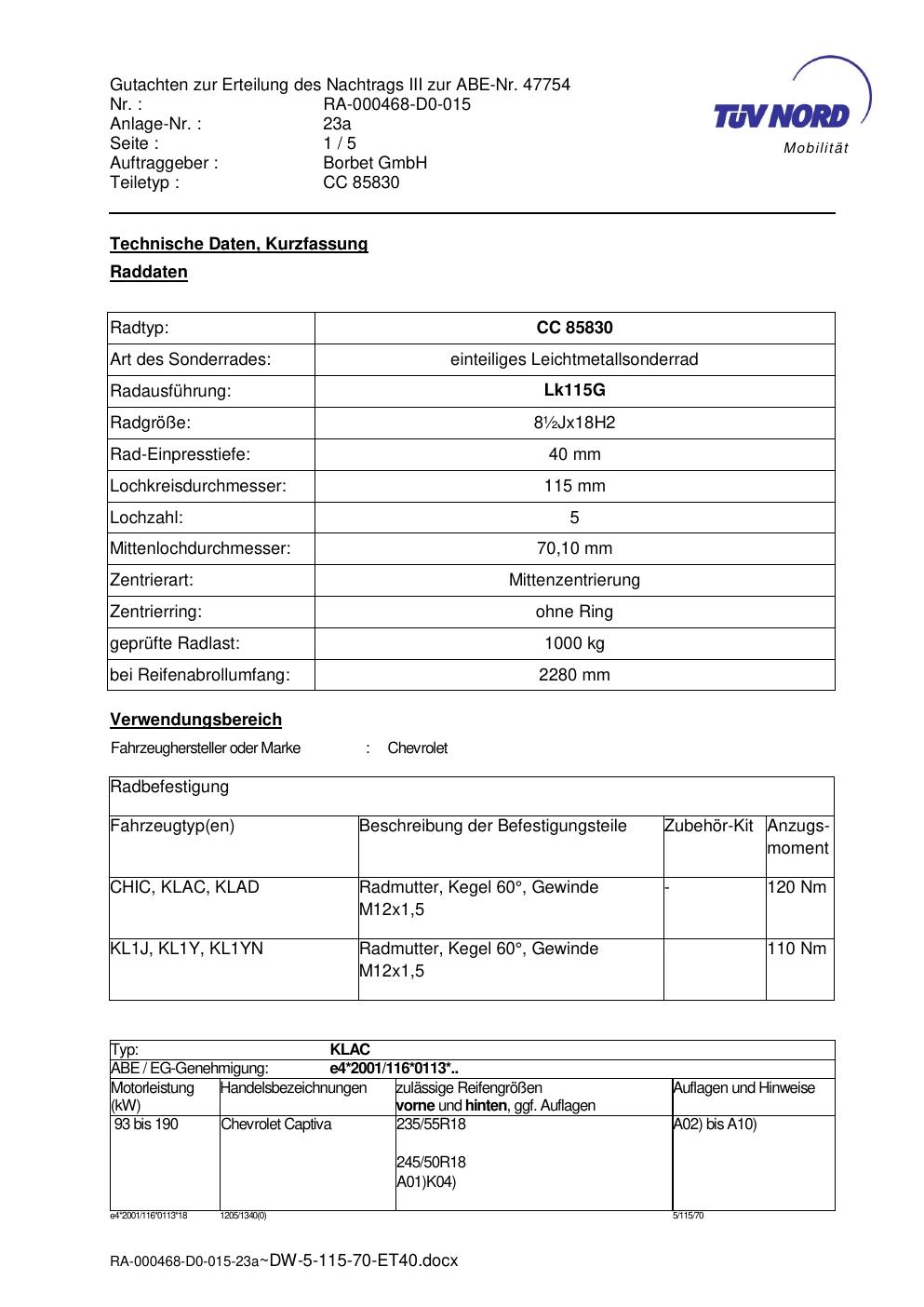 Dieses Gutachten (abe) bezieht sich auf die Alufelge brand-borbet CC 85830 in der Ausführung ET 0, Mittenloch 0 mm (KBA 47754). Im PDF findest du typischerweise zulässige Reifengrößen, Auflagen/Anbauhinweise und – je nach Dokument – Hinweise zur Eintragung.