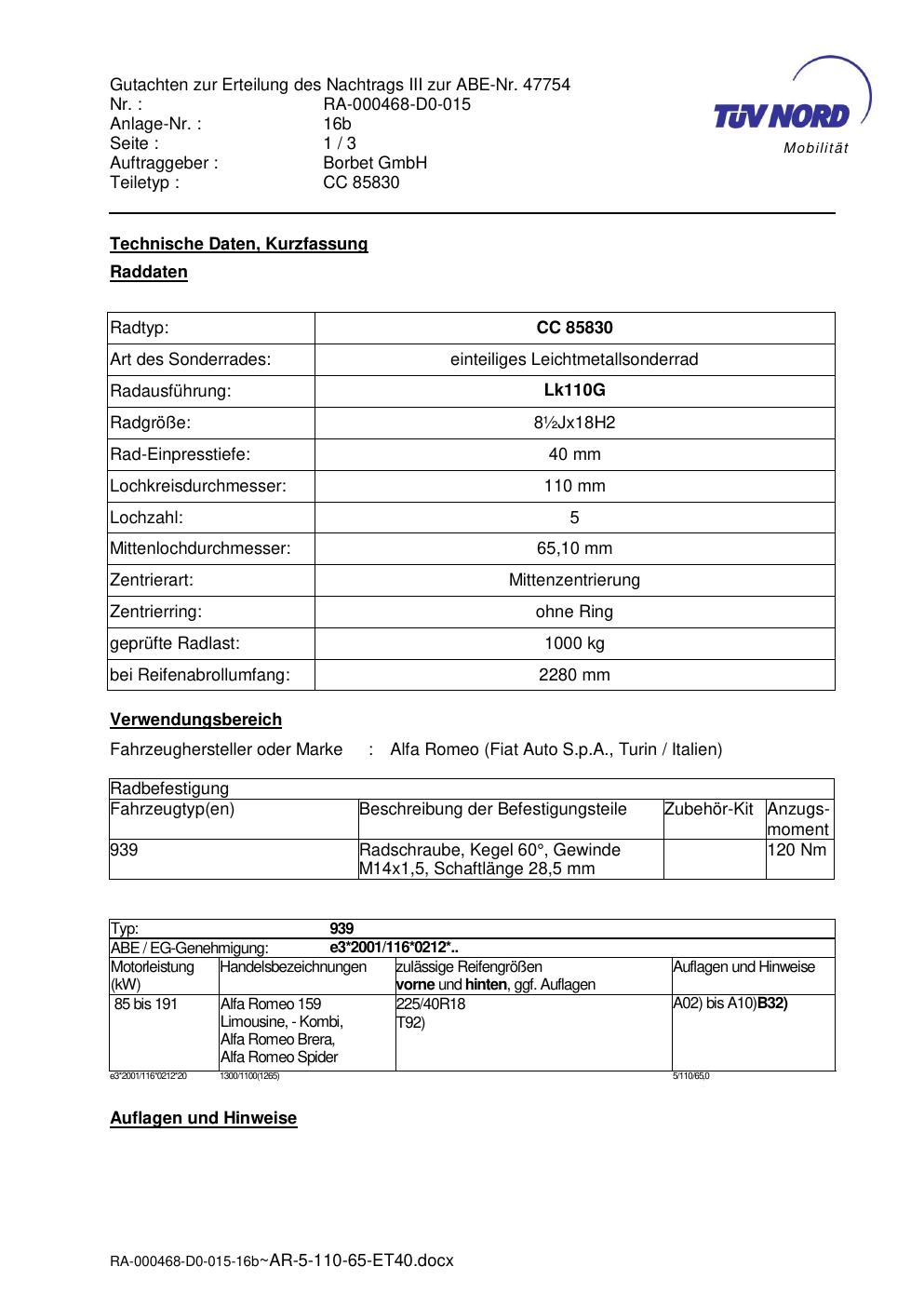 Dieses Gutachten (abe) bezieht sich auf die Alufelge brand-borbet CC 85830 in der Ausführung ET 0, Mittenloch 0 mm (KBA 47754). Im PDF findest du typischerweise zulässige Reifengrößen, Auflagen/Anbauhinweise und – je nach Dokument – Hinweise zur Eintragung.