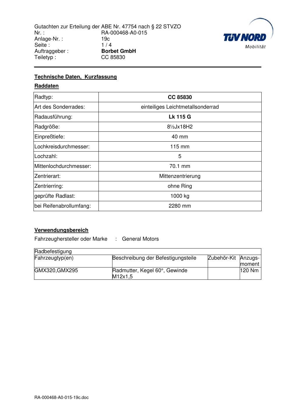 Dieses Gutachten (abe) bezieht sich auf die Alufelge brand-borbet CC 85830 in der Ausführung ET 0, Mittenloch 0 mm (KBA 47754). Im PDF findest du typischerweise zulässige Reifengrößen, Auflagen/Anbauhinweise und – je nach Dokument – Hinweise zur Eintragung.