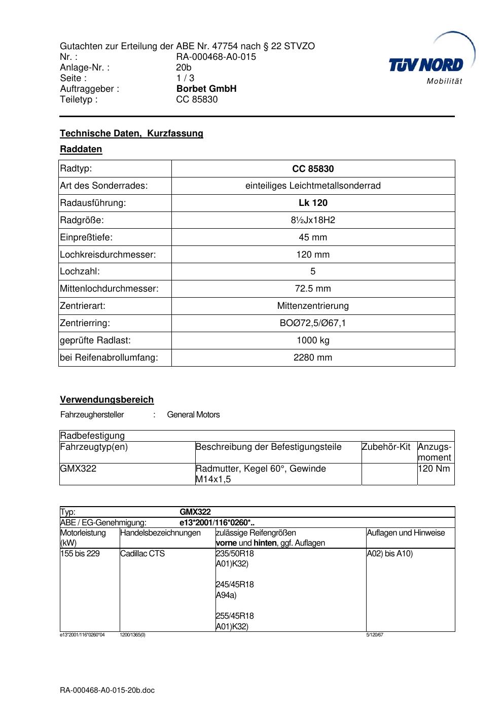 Dieses Gutachten (abe) bezieht sich auf die Alufelge brand-borbet CC 85830 in der Ausführung ET 0, Mittenloch 0 mm (KBA 47754). Im PDF findest du typischerweise zulässige Reifengrößen, Auflagen/Anbauhinweise und – je nach Dokument – Hinweise zur Eintragung.