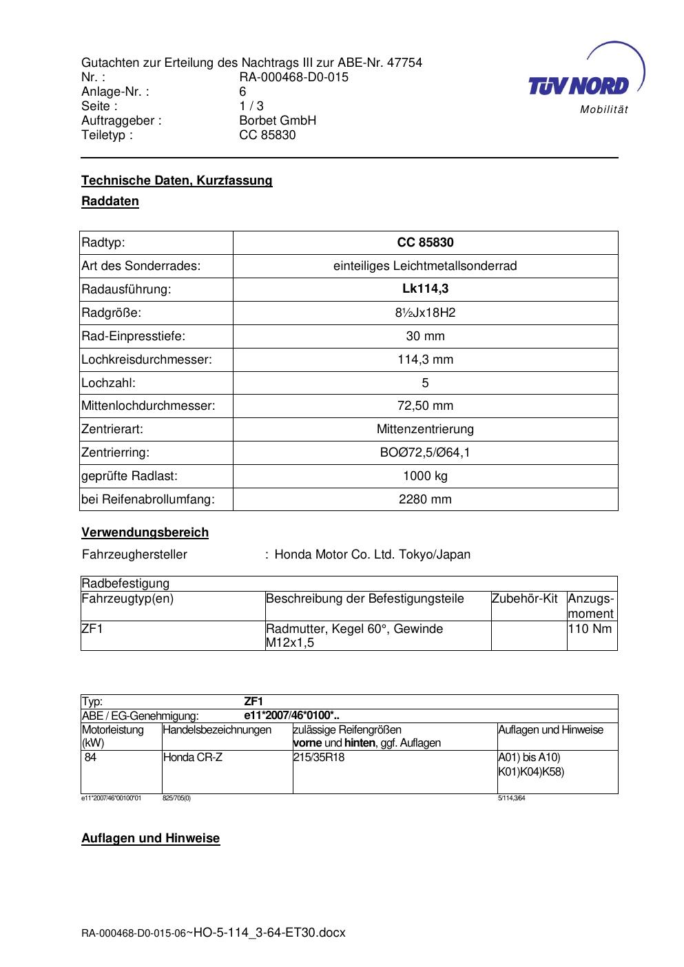 Dieses Gutachten (abe) bezieht sich auf die Alufelge brand-borbet CC 85830 in der Ausführung ET 0, Mittenloch 0 mm (KBA 47754). Im PDF findest du typischerweise zulässige Reifengrößen, Auflagen/Anbauhinweise und – je nach Dokument – Hinweise zur Eintragung.