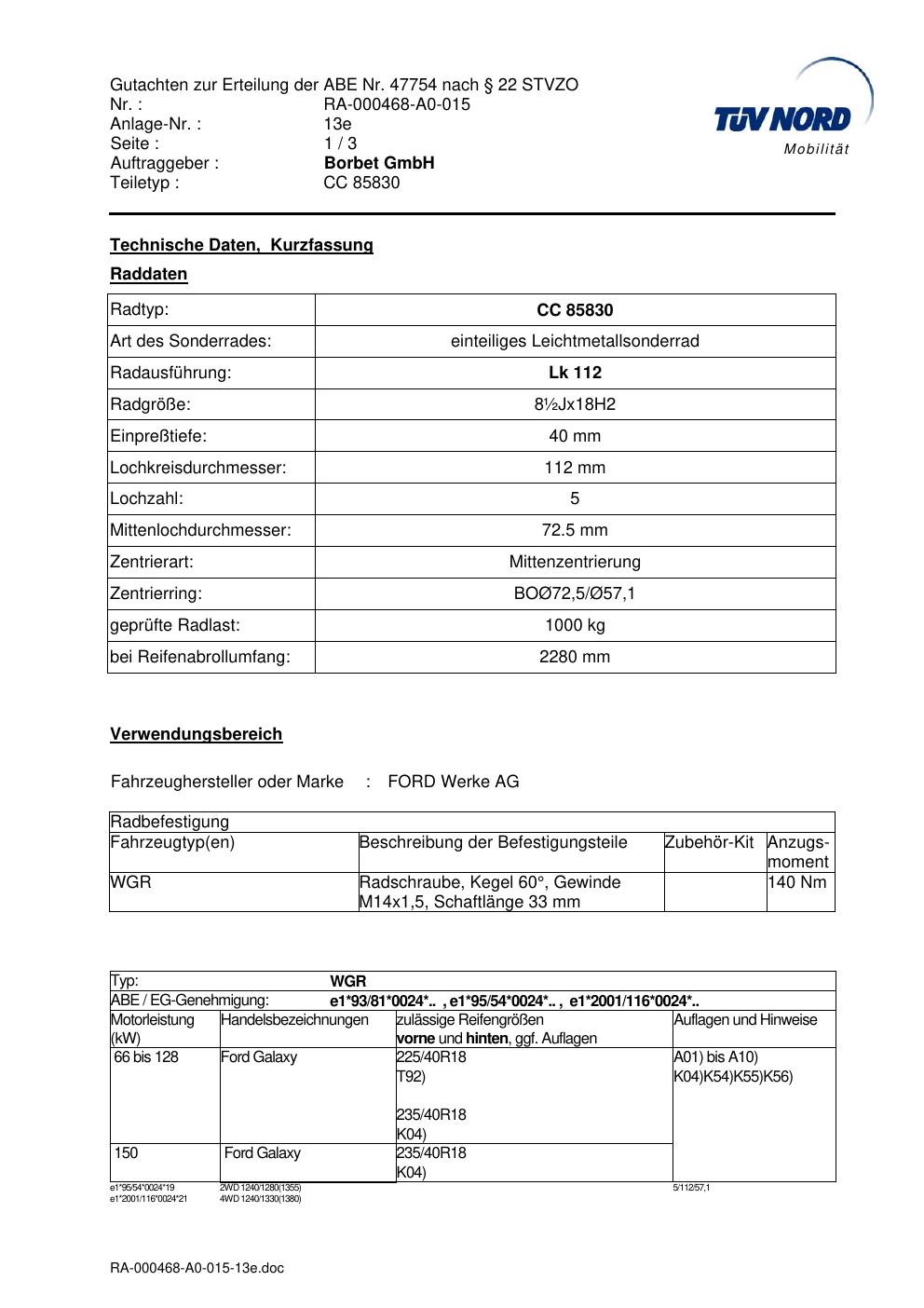 Dieses Gutachten (abe) bezieht sich auf die Alufelge brand-borbet CC 85830 in der Ausführung ET 0, Mittenloch 0 mm (KBA 47754). Im PDF findest du typischerweise zulässige Reifengrößen, Auflagen/Anbauhinweise und – je nach Dokument – Hinweise zur Eintragung.