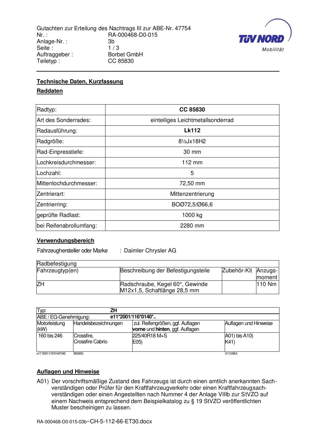 Dieses Gutachten (abe) bezieht sich auf die Alufelge brand-borbet CC 85830 in der Ausführung ET 0, Mittenloch 0 mm (KBA 47754). Im PDF findest du typischerweise zulässige Reifengrößen, Auflagen/Anbauhinweise und – je nach Dokument – Hinweise zur Eintragung.