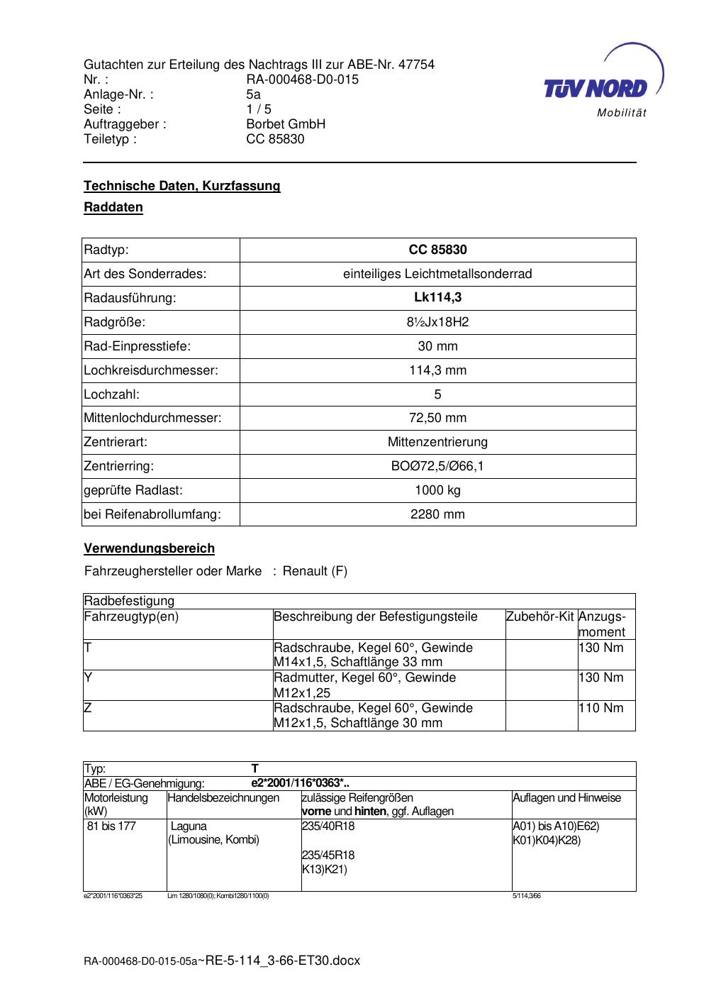 Dieses Gutachten (abe) bezieht sich auf die Alufelge brand-borbet CC 85830 in der Ausführung ET 0, Mittenloch 0 mm (KBA 47754). Im PDF findest du typischerweise zulässige Reifengrößen, Auflagen/Anbauhinweise und – je nach Dokument – Hinweise zur Eintragung.