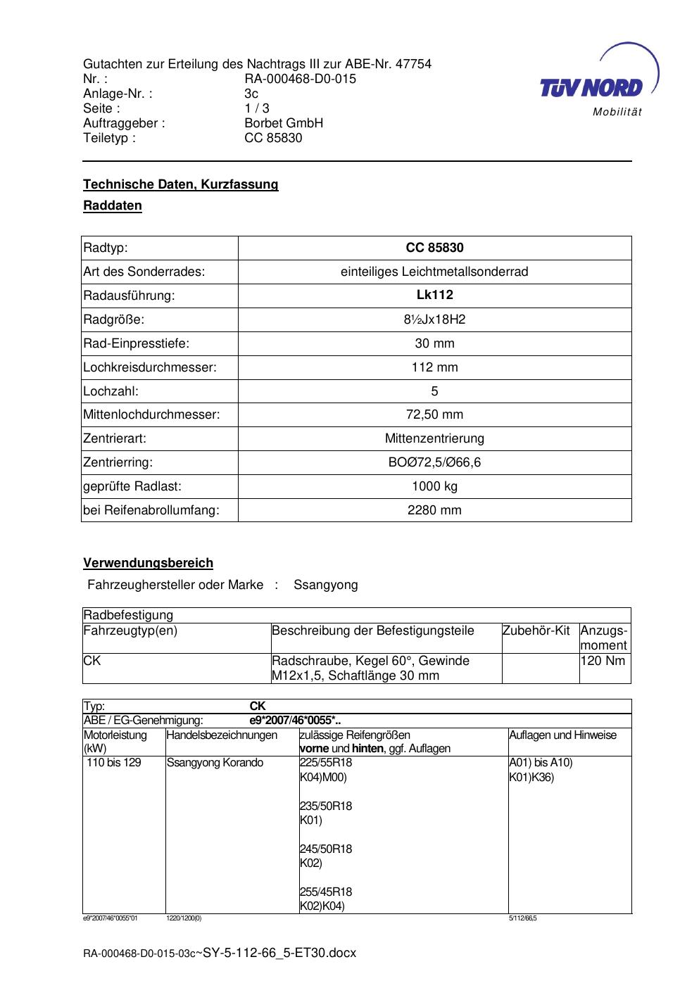Dieses Gutachten (abe) bezieht sich auf die Alufelge brand-borbet CC 85830 in der Ausführung ET 0, Mittenloch 0 mm (KBA 47754). Im PDF findest du typischerweise zulässige Reifengrößen, Auflagen/Anbauhinweise und – je nach Dokument – Hinweise zur Eintragung.