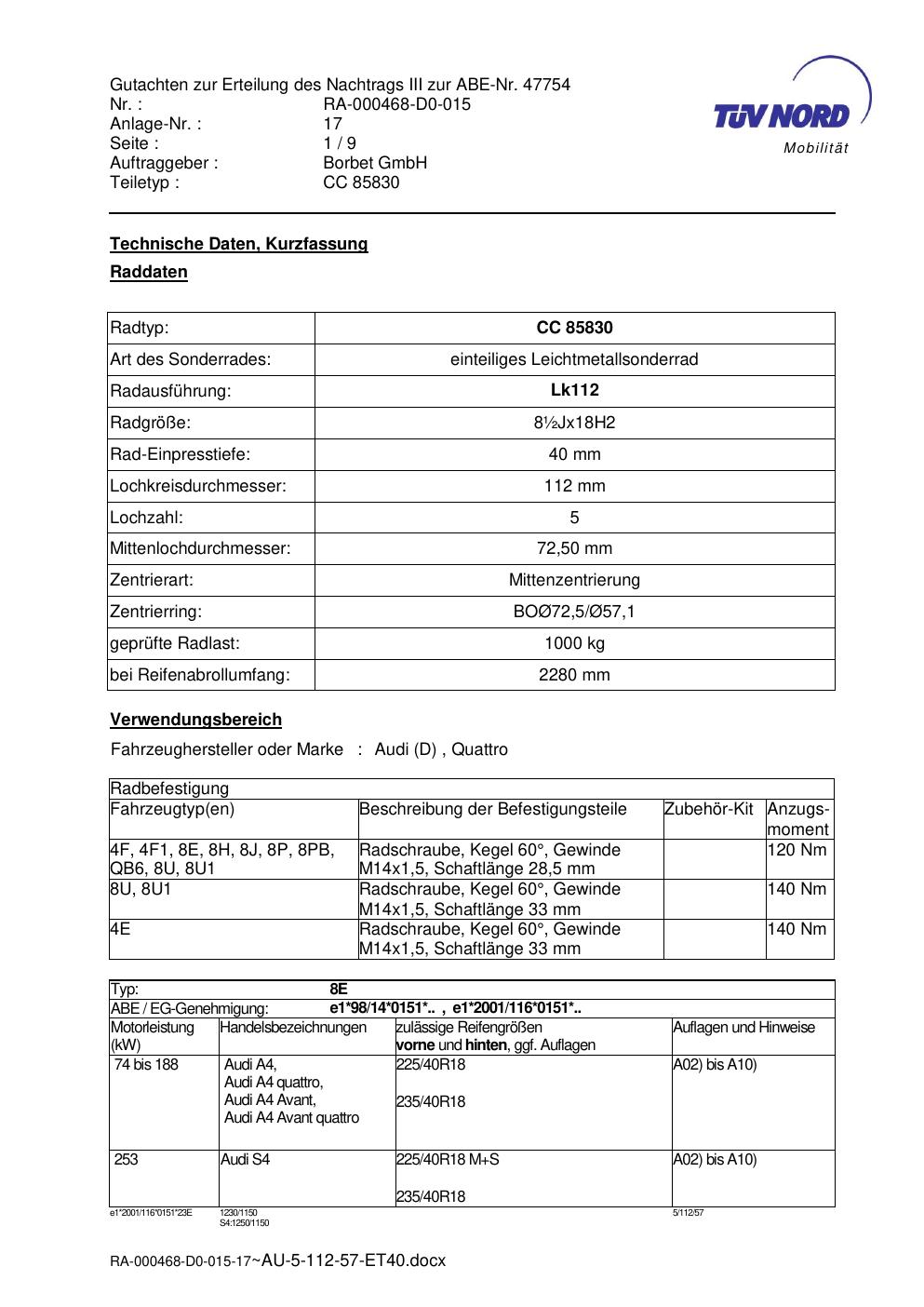 Dieses Gutachten (abe) bezieht sich auf die Alufelge brand-borbet CC 85830 in der Ausführung ET 0, Mittenloch 0 mm (KBA 47754). Im PDF findest du typischerweise zulässige Reifengrößen, Auflagen/Anbauhinweise und – je nach Dokument – Hinweise zur Eintragung.
