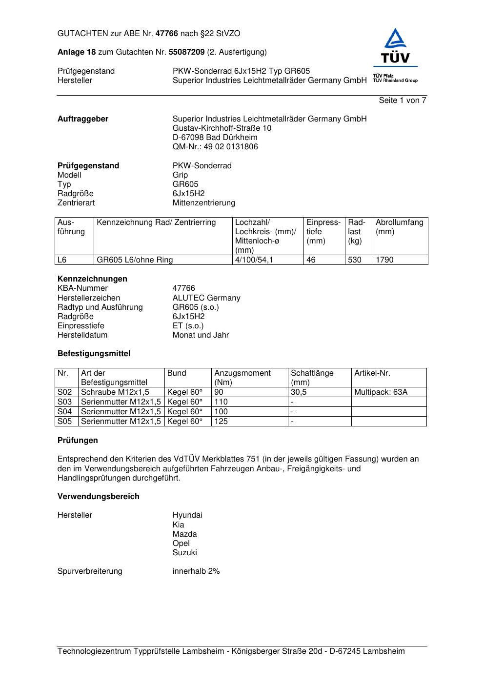 Dieses Gutachten (abe) bezieht sich auf die Alufelge ALUTEC GR605 in der Ausführung 6Jx15 ET 0, Mittenloch 0 mm (KBA 47766). Im PDF findest du typischerweise zulässige Reifengrößen, Auflagen/Anbauhinweise und – je nach Dokument – Hinweise zur Eintragung.