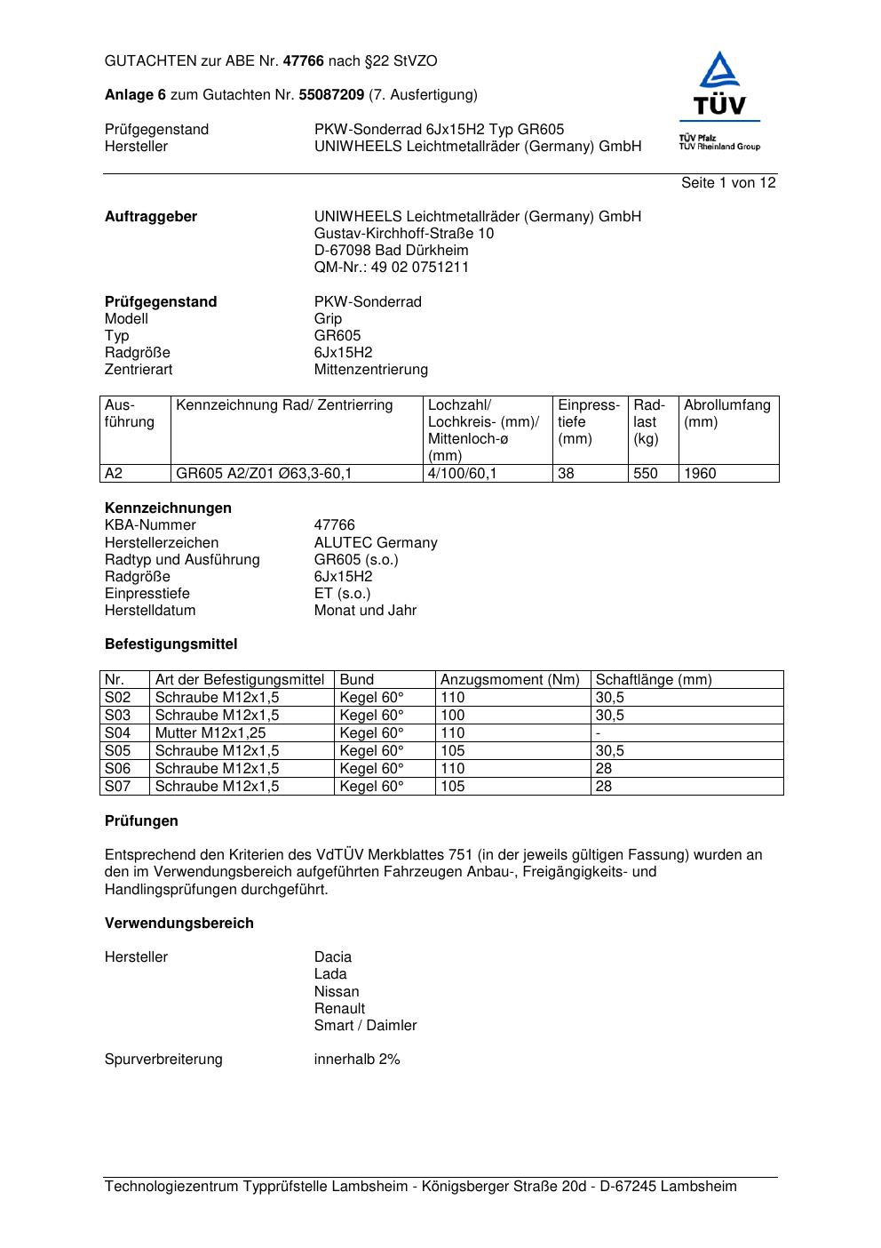 Dieses Gutachten (abe) bezieht sich auf die Alufelge ALUTEC GR605 in der Ausführung 6Jx15 ET 0, Mittenloch 0 mm (KBA 47766). Im PDF findest du typischerweise zulässige Reifengrößen, Auflagen/Anbauhinweise und – je nach Dokument – Hinweise zur Eintragung.