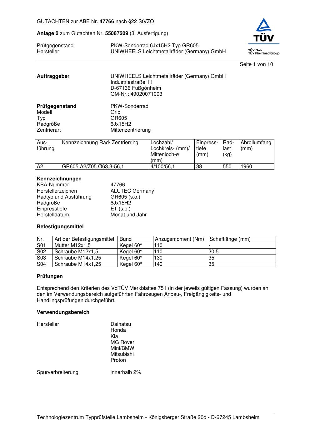 Dieses Gutachten (abe) bezieht sich auf die Alufelge ALUTEC GR605 in der Ausführung 6Jx15 ET 0, Mittenloch 0 mm (KBA 47766). Im PDF findest du typischerweise zulässige Reifengrößen, Auflagen/Anbauhinweise und – je nach Dokument – Hinweise zur Eintragung.