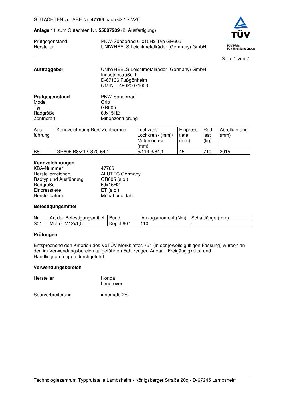 Dieses Gutachten (abe) bezieht sich auf die Alufelge ALUTEC GR605 in der Ausführung 6Jx15 ET 0, Mittenloch 0 mm (KBA 47766). Im PDF findest du typischerweise zulässige Reifengrößen, Auflagen/Anbauhinweise und – je nach Dokument – Hinweise zur Eintragung.