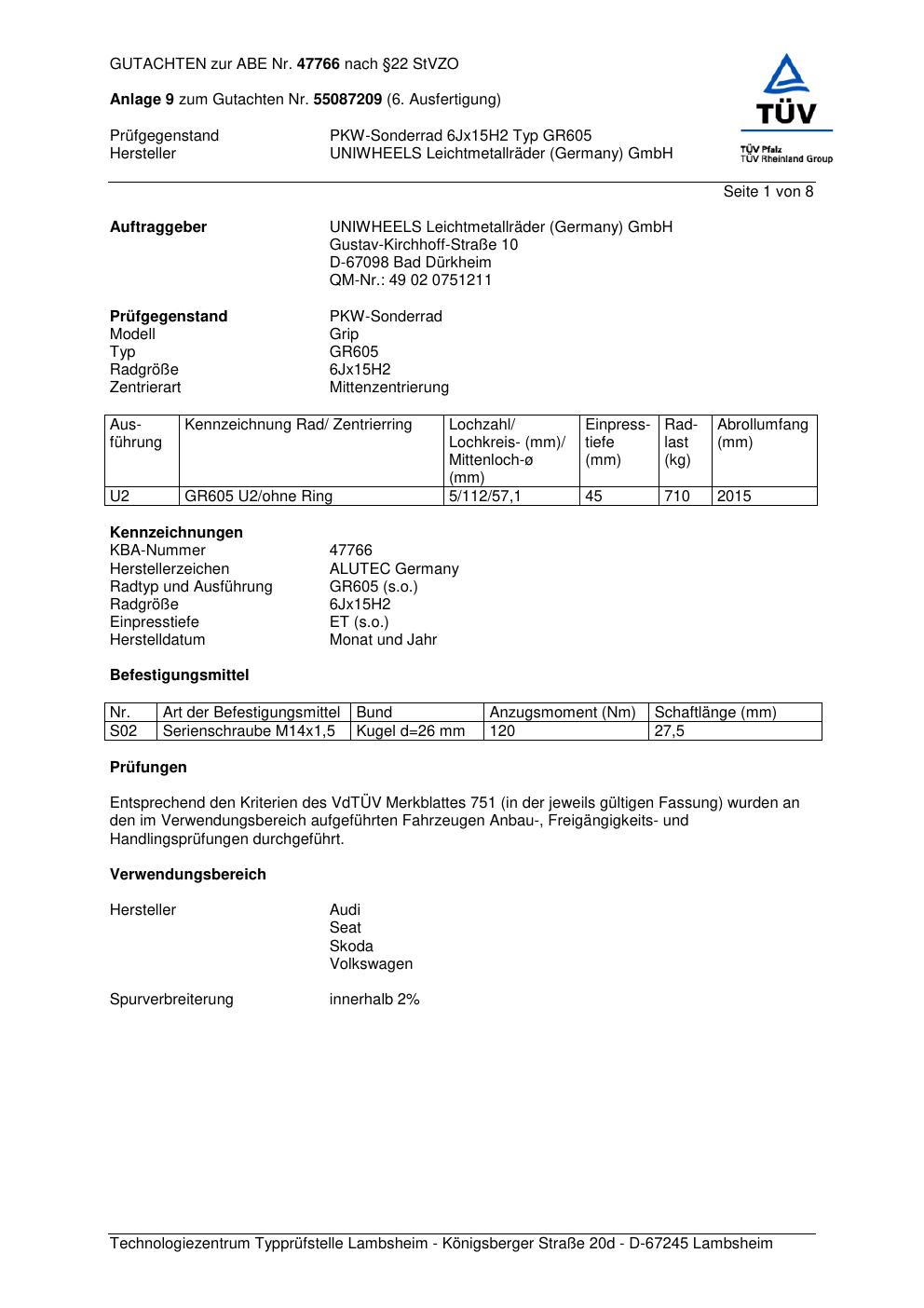 Dieses Gutachten (abe) bezieht sich auf die Alufelge ALUTEC GR605 in der Ausführung 6Jx15 ET 0, Mittenloch 0 mm (KBA 47766). Im PDF findest du typischerweise zulässige Reifengrößen, Auflagen/Anbauhinweise und – je nach Dokument – Hinweise zur Eintragung.