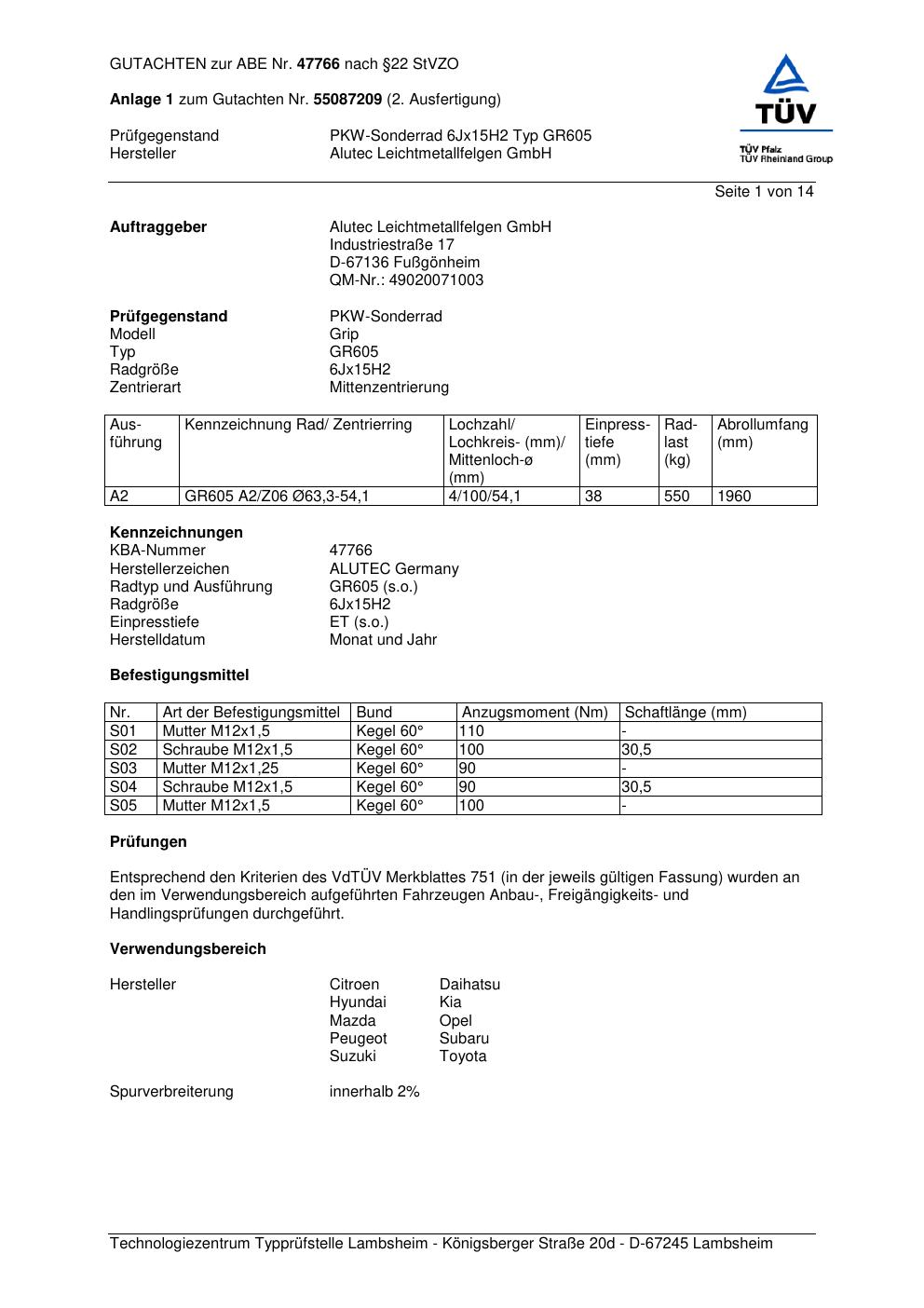 Dieses Gutachten (abe) bezieht sich auf die Alufelge ALUTEC GR605 in der Ausführung 6Jx15 ET 0, Mittenloch 0 mm (KBA 47766). Im PDF findest du typischerweise zulässige Reifengrößen, Auflagen/Anbauhinweise und – je nach Dokument – Hinweise zur Eintragung.