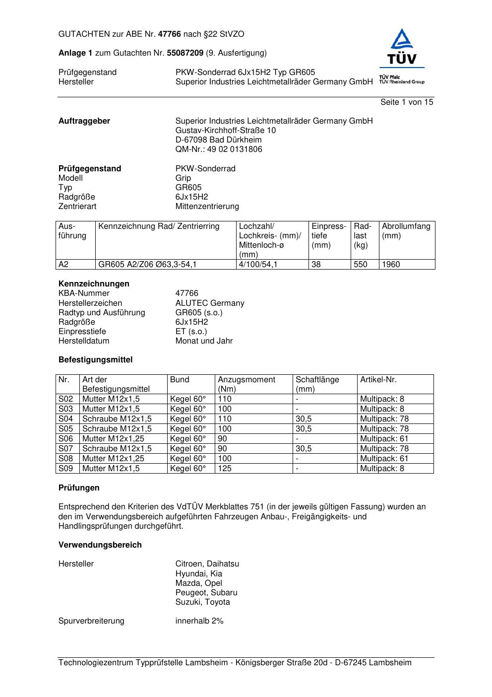 Dieses Gutachten (abe) bezieht sich auf die Alufelge ALUTEC GR605 in der Ausführung 6Jx15 ET 0, Mittenloch 0 mm (KBA 47766). Im PDF findest du typischerweise zulässige Reifengrößen, Auflagen/Anbauhinweise und – je nach Dokument – Hinweise zur Eintragung.