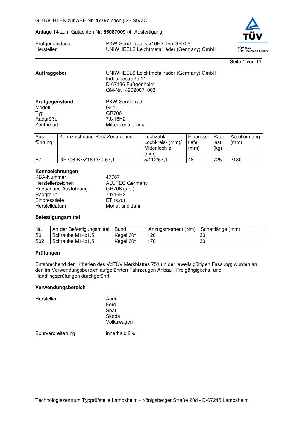 Dieses Gutachten (abe) bezieht sich auf die Alufelge ALUTEC GR706 in der Ausführung 7Jx16 ET 0, Mittenloch 0 mm (KBA 47767). Im PDF findest du typischerweise zulässige Reifengrößen, Auflagen/Anbauhinweise und – je nach Dokument – Hinweise zur Eintragung.