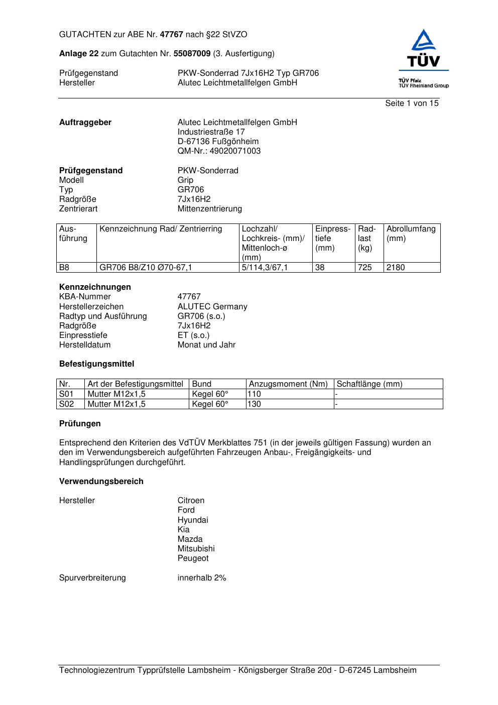 Dieses Gutachten (abe) bezieht sich auf die Alufelge ALUTEC GR706 in der Ausführung 7Jx16 ET 0, Mittenloch 0 mm (KBA 47767). Im PDF findest du typischerweise zulässige Reifengrößen, Auflagen/Anbauhinweise und – je nach Dokument – Hinweise zur Eintragung.