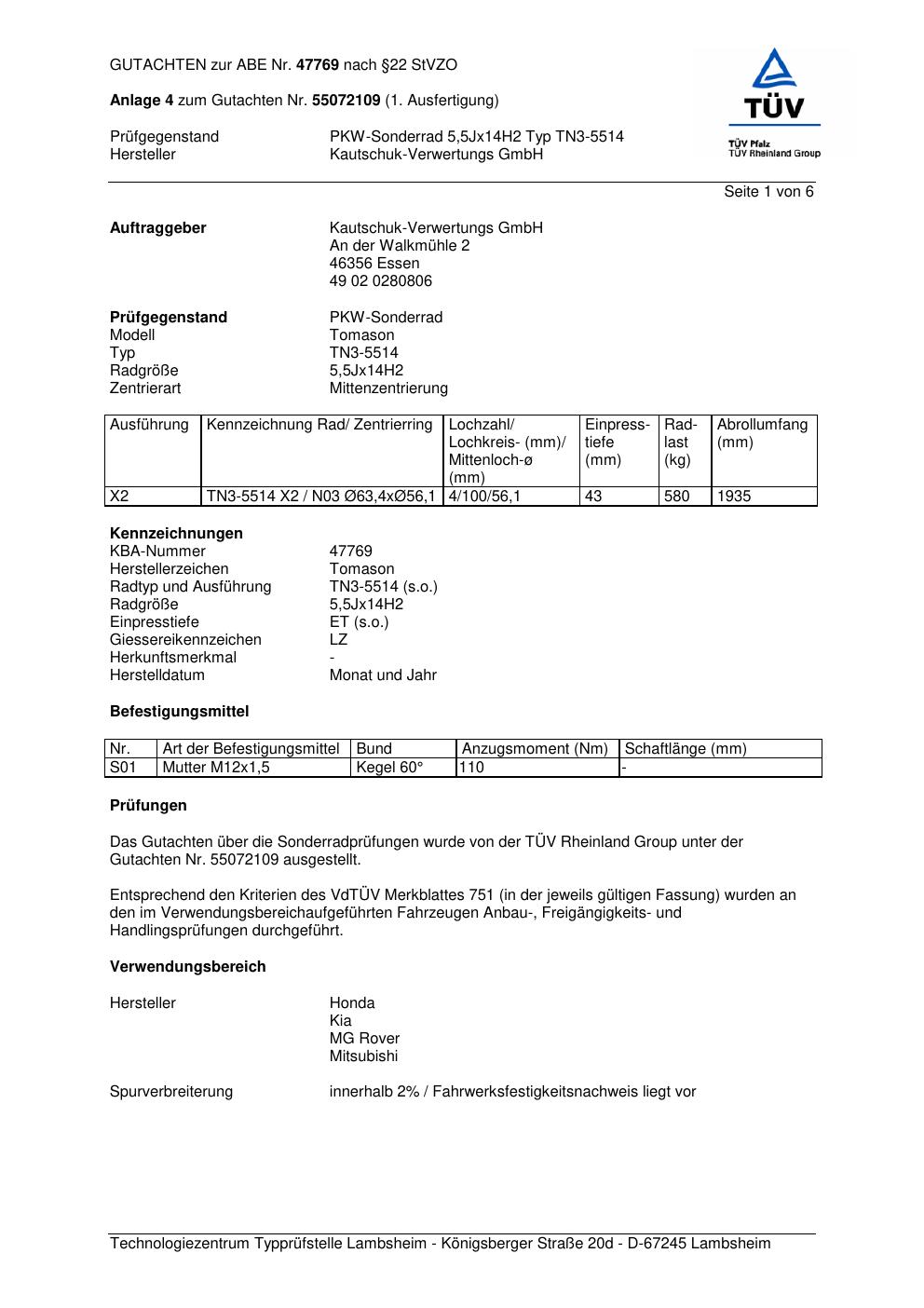 Felgengutachten / abe für Alufelgen co-rod TN3-5514 (5.5Jx14 ET 0, Mittenloch 0 mm) mit KBA 47769 (Zertifikatsnummer 47769). Hier kostenlos als PDF herunterladen. Der Download-Link ist 24 Stunden gültig und kann bis zu zwei Mal verwendet werden.
