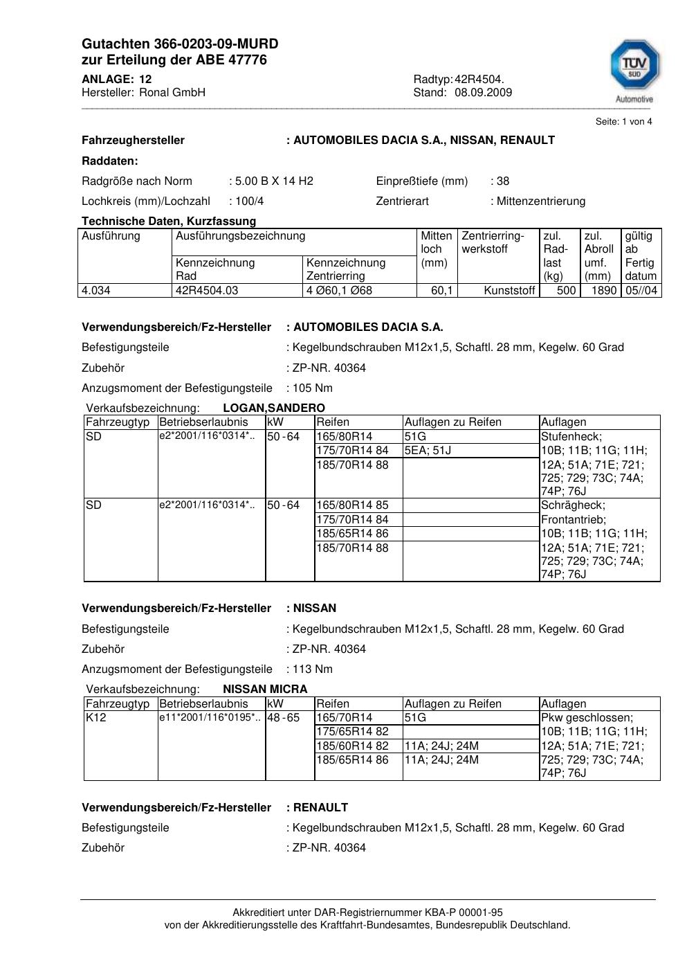 Dieses Gutachten (abe) bezieht sich auf die Alufelge Ronal 42R4504 in der Ausführung ET 0, Mittenloch 0 mm (KBA 47776). Im PDF findest du typischerweise zulässige Reifengrößen, Auflagen/Anbauhinweise und – je nach Dokument – Hinweise zur Eintragung.