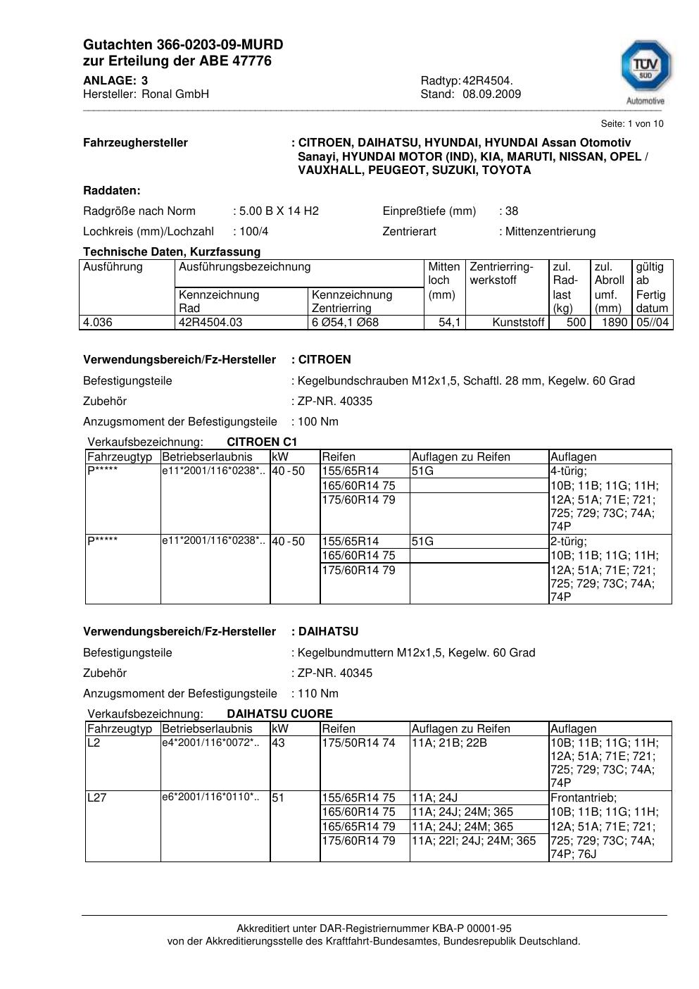 Dieses Gutachten (abe) bezieht sich auf die Alufelge Ronal 42R4504 in der Ausführung ET 0, Mittenloch 0 mm (KBA 47776). Im PDF findest du typischerweise zulässige Reifengrößen, Auflagen/Anbauhinweise und – je nach Dokument – Hinweise zur Eintragung.