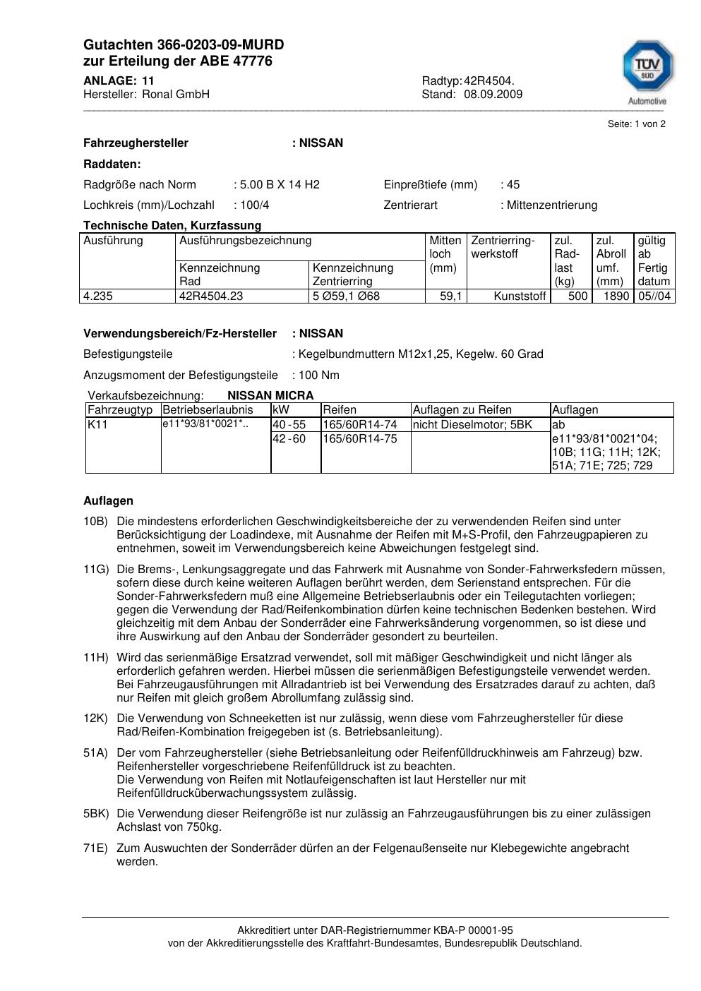 Dieses Gutachten (abe) bezieht sich auf die Alufelge Ronal 42R4504 in der Ausführung ET 0, Mittenloch 0 mm (KBA 47776). Im PDF findest du typischerweise zulässige Reifengrößen, Auflagen/Anbauhinweise und – je nach Dokument – Hinweise zur Eintragung.