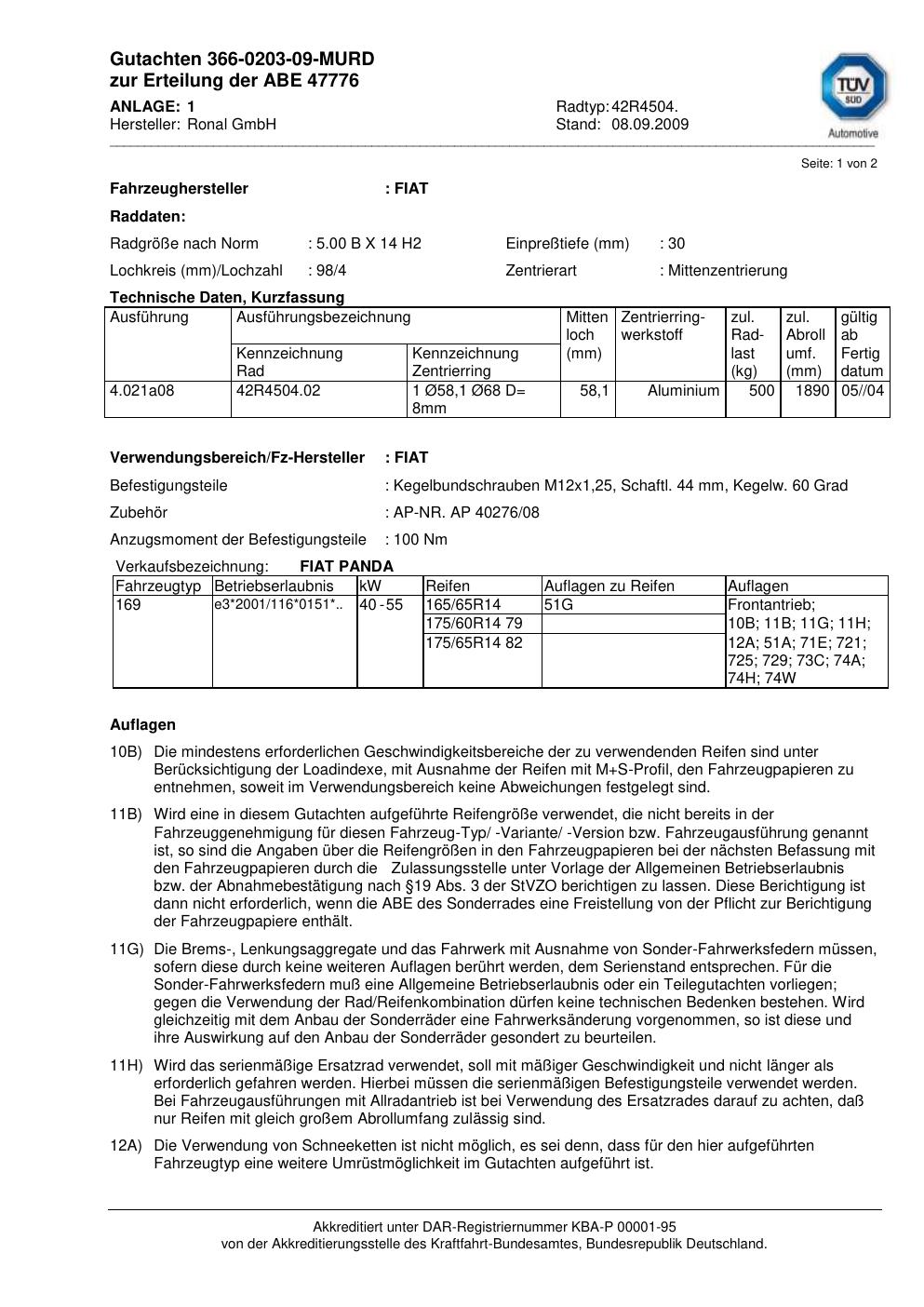 Dieses Gutachten (abe) bezieht sich auf die Alufelge Ronal 42R4504 in der Ausführung ET 0, Mittenloch 0 mm (KBA 47776). Im PDF findest du typischerweise zulässige Reifengrößen, Auflagen/Anbauhinweise und – je nach Dokument – Hinweise zur Eintragung.