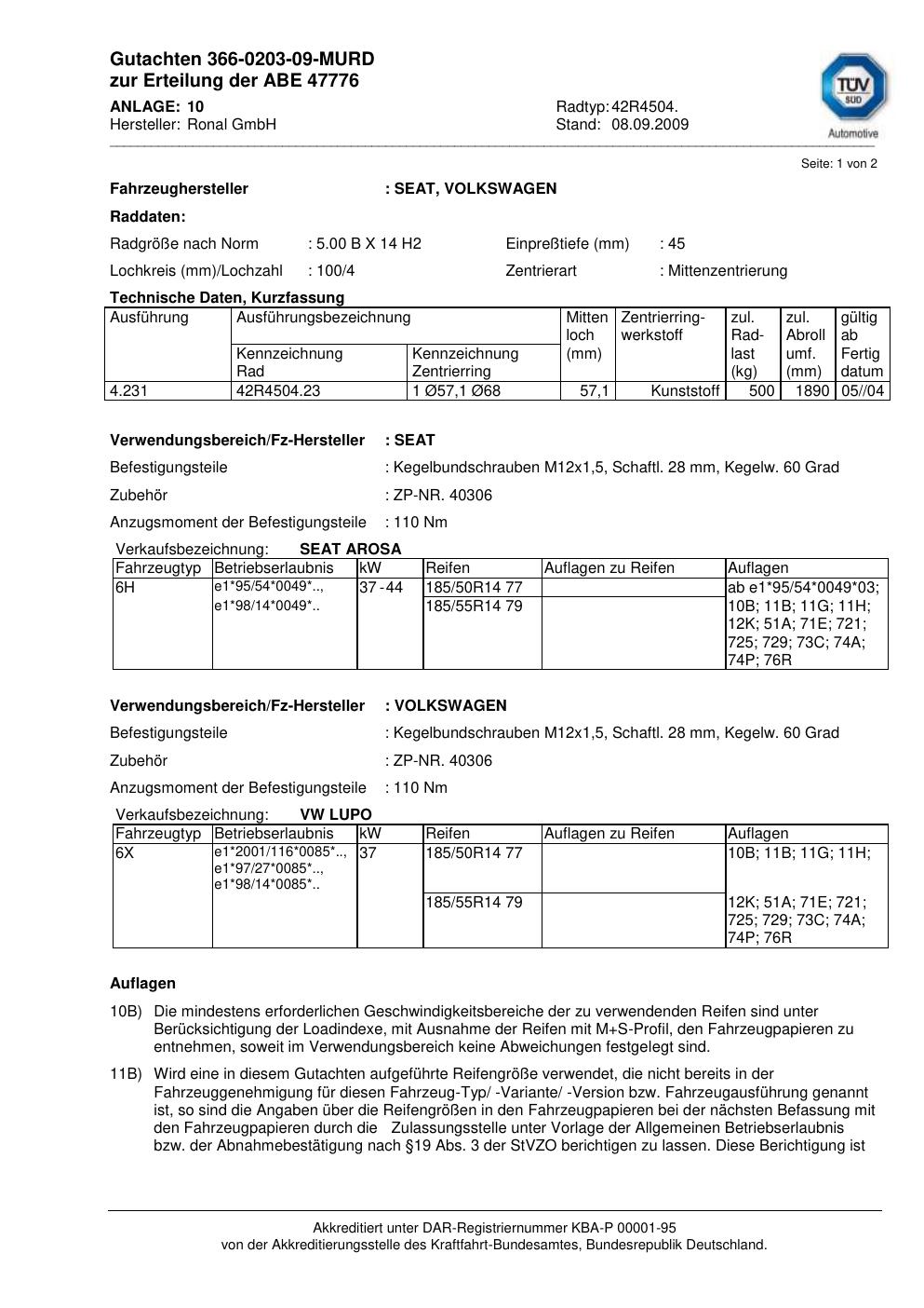 Dieses Gutachten (abe) bezieht sich auf die Alufelge Ronal 42R4504 in der Ausführung ET 0, Mittenloch 0 mm (KBA 47776). Im PDF findest du typischerweise zulässige Reifengrößen, Auflagen/Anbauhinweise und – je nach Dokument – Hinweise zur Eintragung.