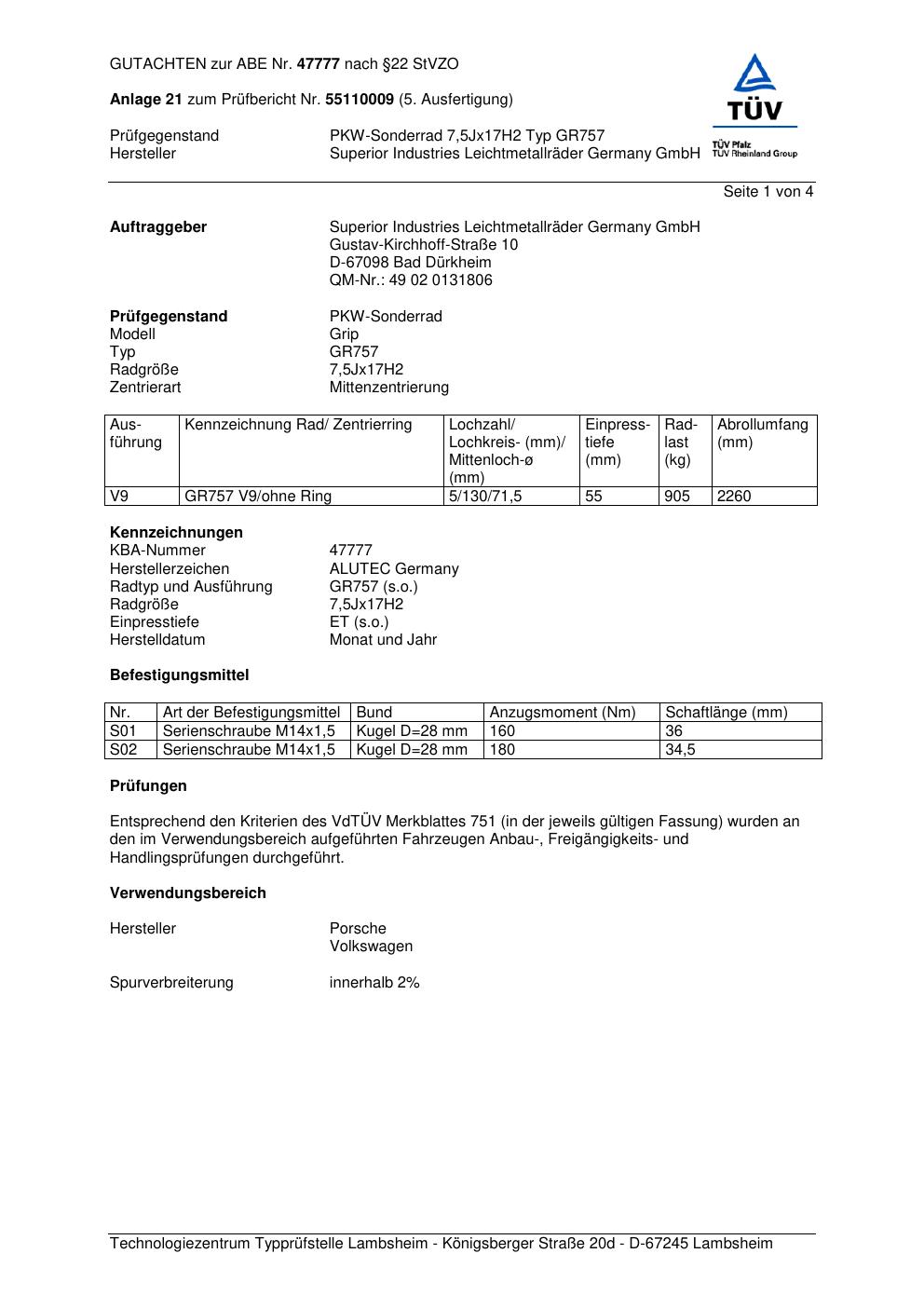 Dieses Gutachten (abe) bezieht sich auf die Alufelge ALUTEC GR757 in der Ausführung 7.5Jx17 ET 0, Mittenloch 0 mm (KBA 47777). Im PDF findest du typischerweise zulässige Reifengrößen, Auflagen/Anbauhinweise und – je nach Dokument – Hinweise zur Eintragung.