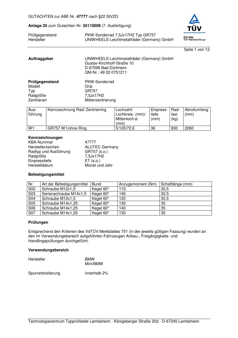 Dieses Gutachten (abe) bezieht sich auf die Alufelge ALUTEC GR757 in der Ausführung 7.5Jx17 ET 0, Mittenloch 0 mm (KBA 47777). Im PDF findest du typischerweise zulässige Reifengrößen, Auflagen/Anbauhinweise und – je nach Dokument – Hinweise zur Eintragung.