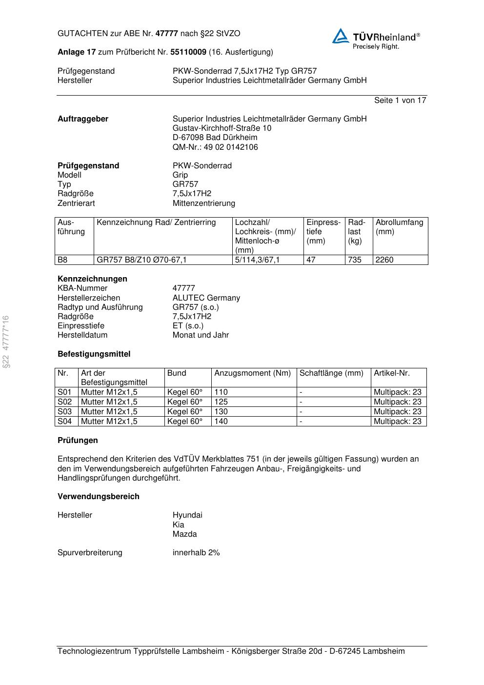 Dieses Gutachten (abe) bezieht sich auf die Alufelge ALUTEC GR757 in der Ausführung 7.5Jx17 ET 0, Mittenloch 0 mm (KBA 47777). Im PDF findest du typischerweise zulässige Reifengrößen, Auflagen/Anbauhinweise und – je nach Dokument – Hinweise zur Eintragung.