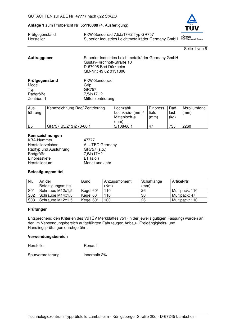 Dieses Gutachten (abe) bezieht sich auf die Alufelge ALUTEC GR757 in der Ausführung 7.5Jx17 ET 0, Mittenloch 0 mm (KBA 47777). Im PDF findest du typischerweise zulässige Reifengrößen, Auflagen/Anbauhinweise und – je nach Dokument – Hinweise zur Eintragung.