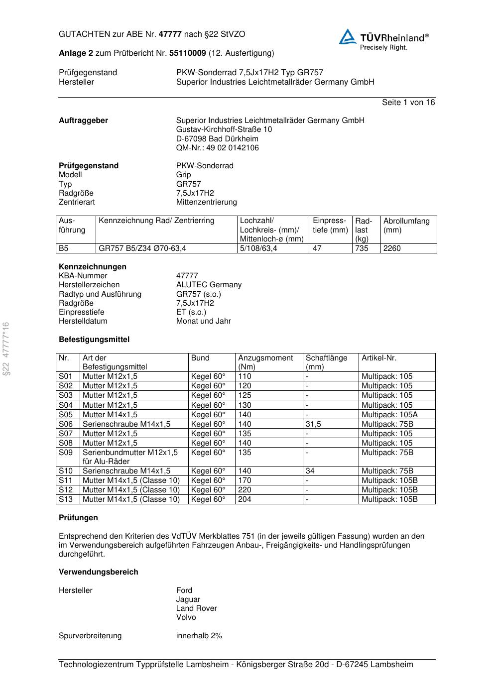 Dieses Gutachten (abe) bezieht sich auf die Alufelge ALUTEC GR757 in der Ausführung 7.5Jx17 ET 0, Mittenloch 0 mm (KBA 47777). Im PDF findest du typischerweise zulässige Reifengrößen, Auflagen/Anbauhinweise und – je nach Dokument – Hinweise zur Eintragung.