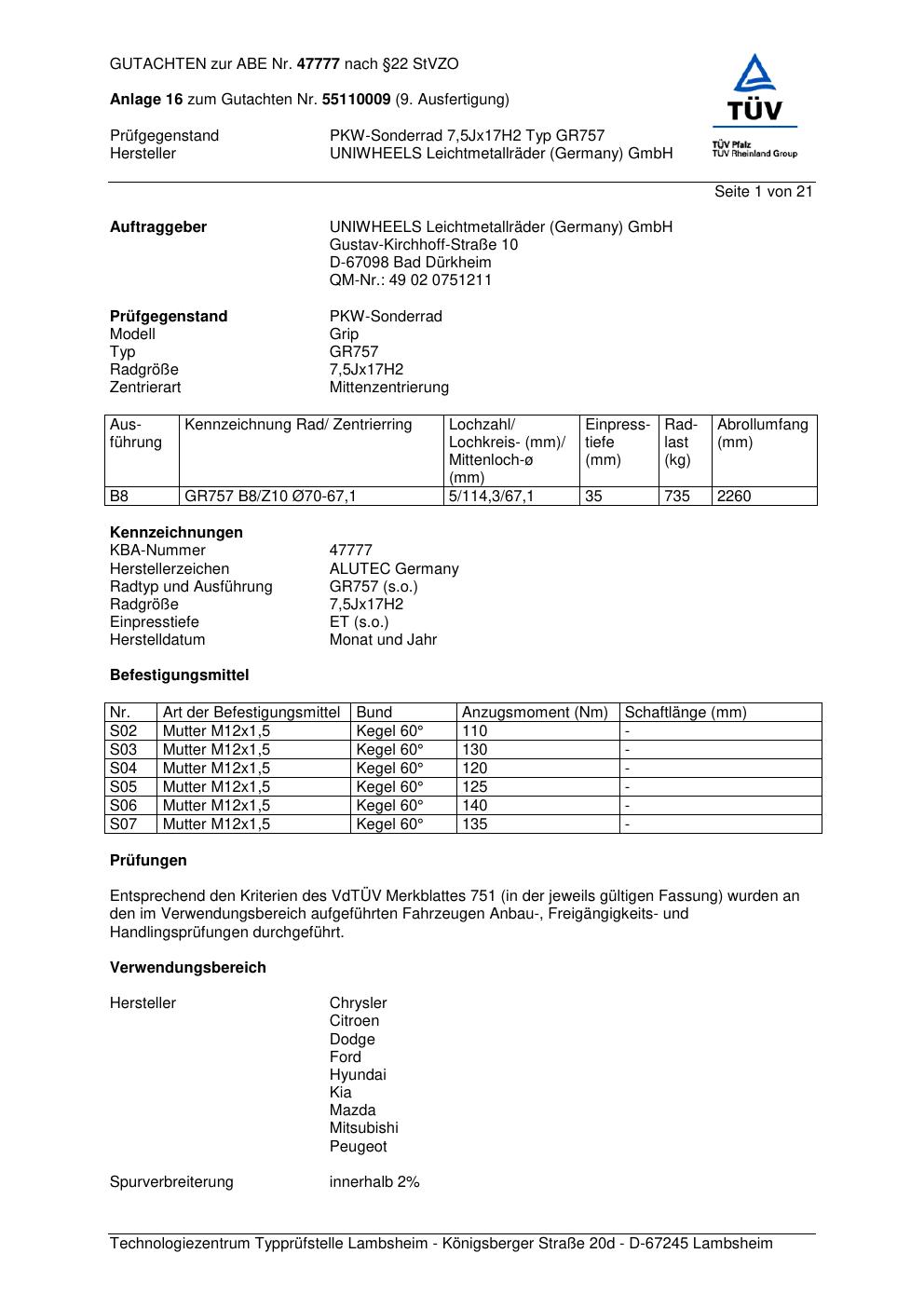 Dieses Gutachten (abe) bezieht sich auf die Alufelge ALUTEC GR757 in der Ausführung 7.5Jx17 ET 0, Mittenloch 0 mm (KBA 47777). Im PDF findest du typischerweise zulässige Reifengrößen, Auflagen/Anbauhinweise und – je nach Dokument – Hinweise zur Eintragung.
