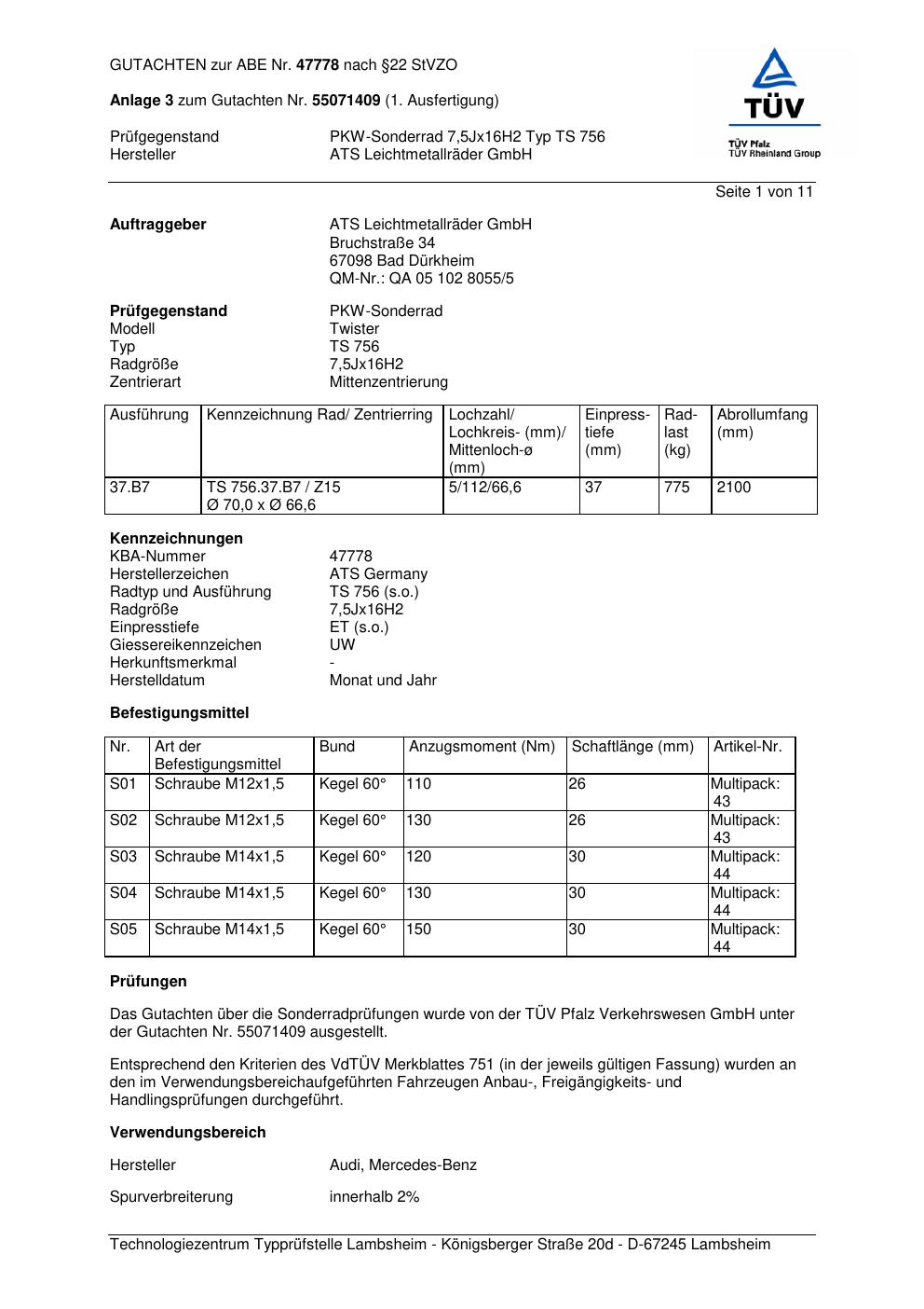 Dieses Gutachten (abe) bezieht sich auf die Alufelge ATS TS 756 in der Ausführung 7.5Jx16 ET 0, Mittenloch 0 mm (KBA 47778). Im PDF findest du typischerweise zulässige Reifengrößen, Auflagen/Anbauhinweise und – je nach Dokument – Hinweise zur Eintragung.