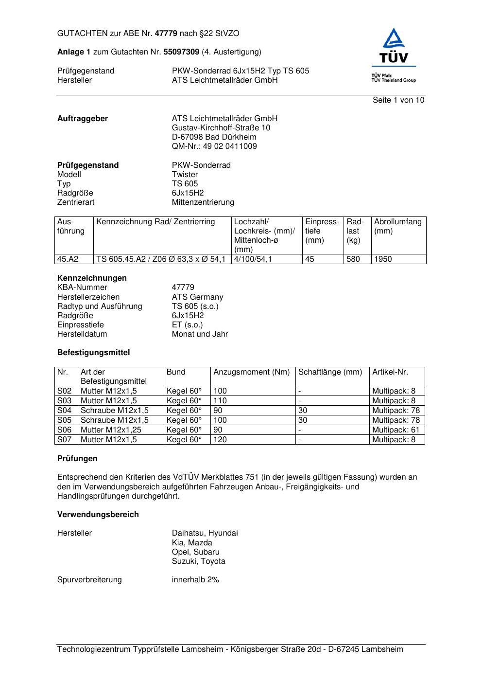 Dieses Gutachten (abe) bezieht sich auf die Alufelge ATS TS 605 in der Ausführung 6Jx15 ET 0, Mittenloch 0 mm (KBA 47779). Im PDF findest du typischerweise zulässige Reifengrößen, Auflagen/Anbauhinweise und – je nach Dokument – Hinweise zur Eintragung.