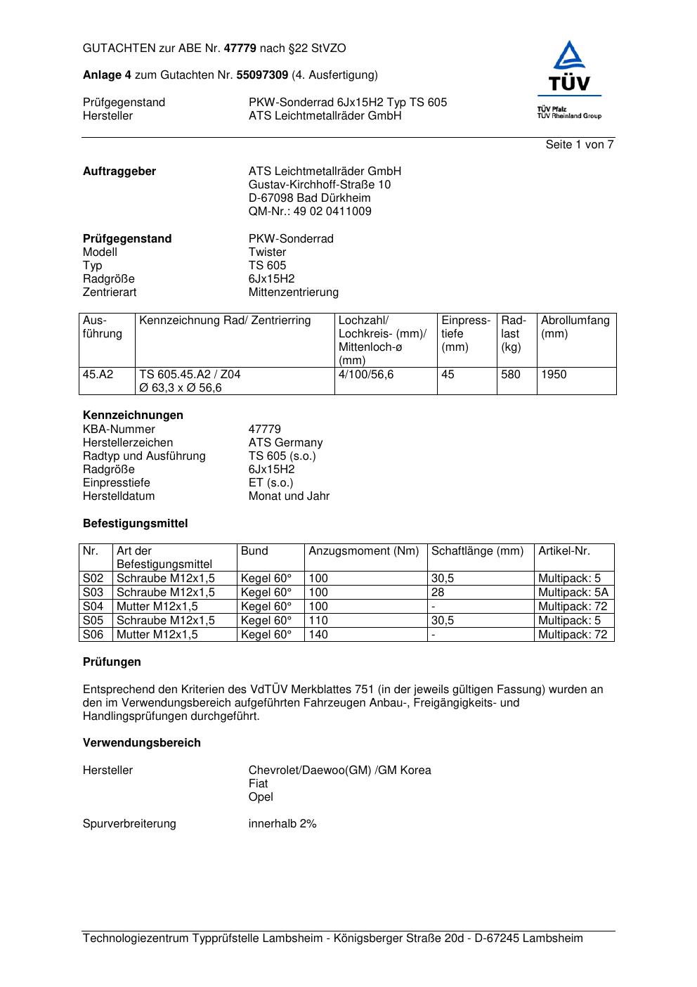 Dieses Gutachten (abe) bezieht sich auf die Alufelge ATS TS 605 in der Ausführung 6Jx15 ET 0, Mittenloch 0 mm (KBA 47779). Im PDF findest du typischerweise zulässige Reifengrößen, Auflagen/Anbauhinweise und – je nach Dokument – Hinweise zur Eintragung.