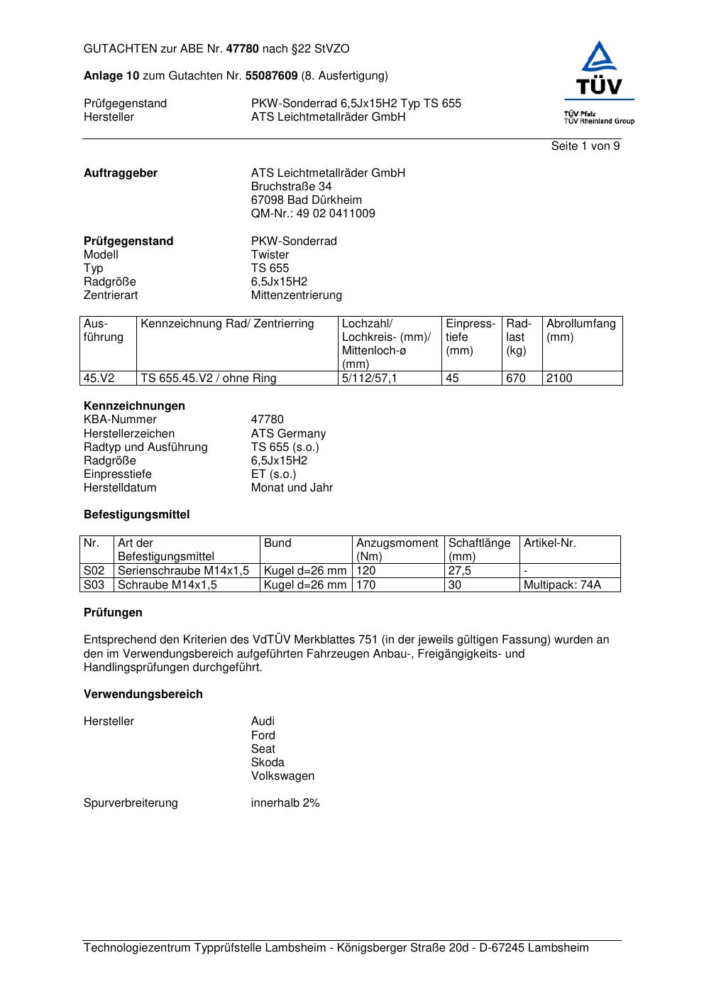 Dieses Gutachten (abe) bezieht sich auf die Alufelge ATS TS 655 in der Ausführung 6.5Jx15 ET 0, Mittenloch 0 mm (KBA 47780). Im PDF findest du typischerweise zulässige Reifengrößen, Auflagen/Anbauhinweise und – je nach Dokument – Hinweise zur Eintragung.