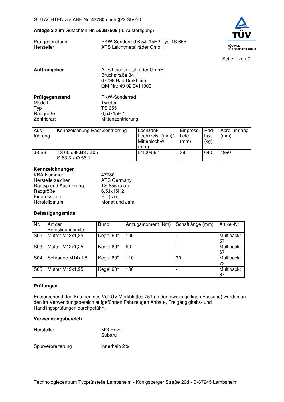 Dieses Gutachten (abe) bezieht sich auf die Alufelge ATS TS 655 in der Ausführung 6.5Jx15 ET 0, Mittenloch 0 mm (KBA 47780). Im PDF findest du typischerweise zulässige Reifengrößen, Auflagen/Anbauhinweise und – je nach Dokument – Hinweise zur Eintragung.
