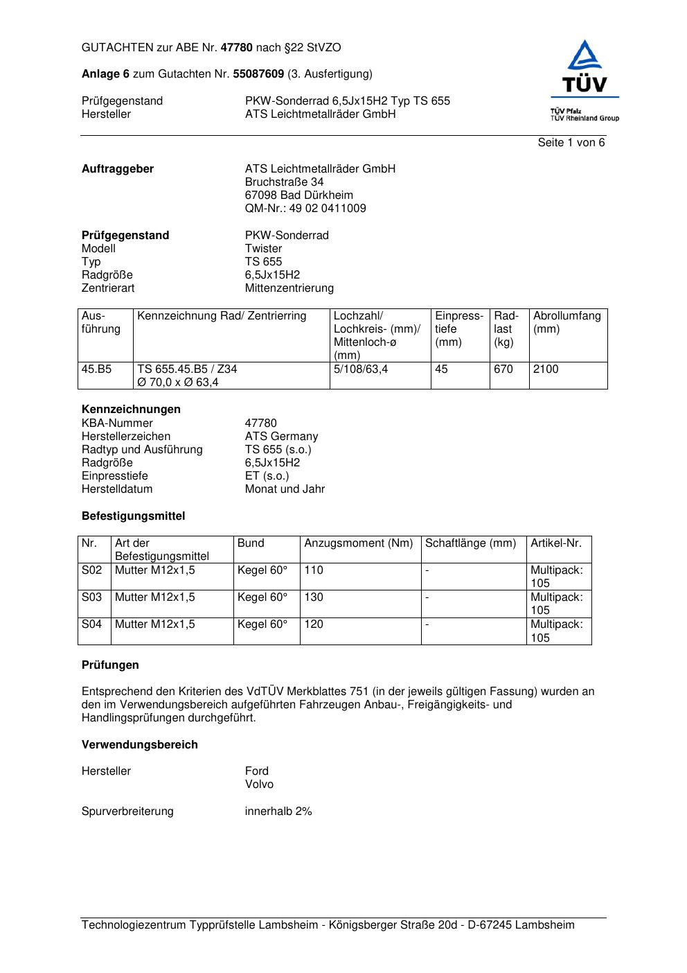 Dieses Gutachten (abe) bezieht sich auf die Alufelge ATS TS 655 in der Ausführung 6.5Jx15 ET 0, Mittenloch 0 mm (KBA 47780). Im PDF findest du typischerweise zulässige Reifengrößen, Auflagen/Anbauhinweise und – je nach Dokument – Hinweise zur Eintragung.