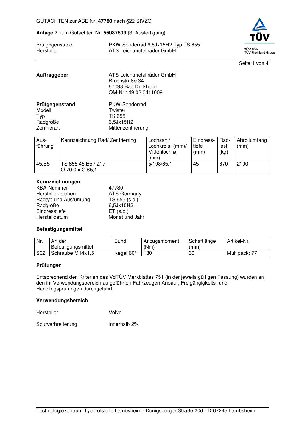 Dieses Gutachten (abe) bezieht sich auf die Alufelge ATS TS 655 in der Ausführung 6.5Jx15 ET 0, Mittenloch 0 mm (KBA 47780). Im PDF findest du typischerweise zulässige Reifengrößen, Auflagen/Anbauhinweise und – je nach Dokument – Hinweise zur Eintragung.