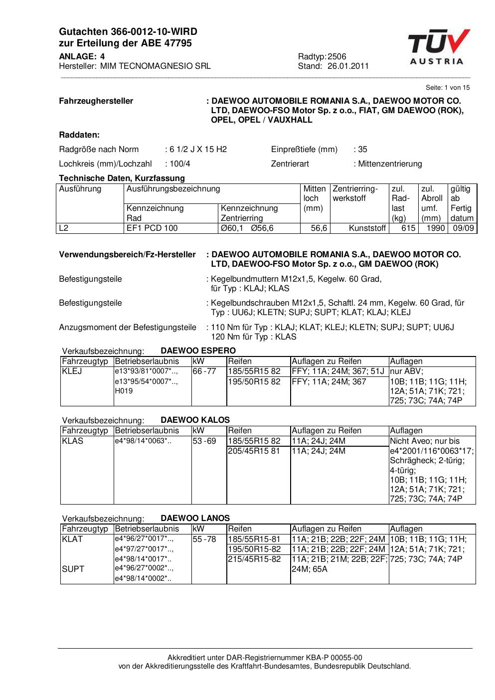 Felgengutachten / abe für Alufelgen ATS 2506 (2Jx15 ET 0, Mittenloch 0 mm) mit KBA 47795 (Zertifikatsnummer 47795). Hier kostenlos als PDF herunterladen. Der Download-Link ist 24 Stunden gültig und kann bis zu zwei Mal verwendet werden.
