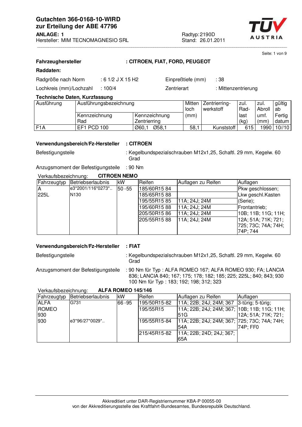 Dieses abe führt 6 Fahrzeugvarianten von 6 Fahrzeugherstellern als zulässig auf. Abgedeckt werden insbesondere Fahrzeuge von ALFA ROMEO, CITROEN, FIAT, FORD, LANCIA, PEUGEOT. Prüfe in der folgenden Liste, ob dein konkretes Fahrzeugmodell und – soweit angegeben – der passende Typ-Code (HSN/TSN-Variante) dabei ist. Der Typ-Code steht im Fahrzeugschein unter den Ziffern 2.1 und 2.2.