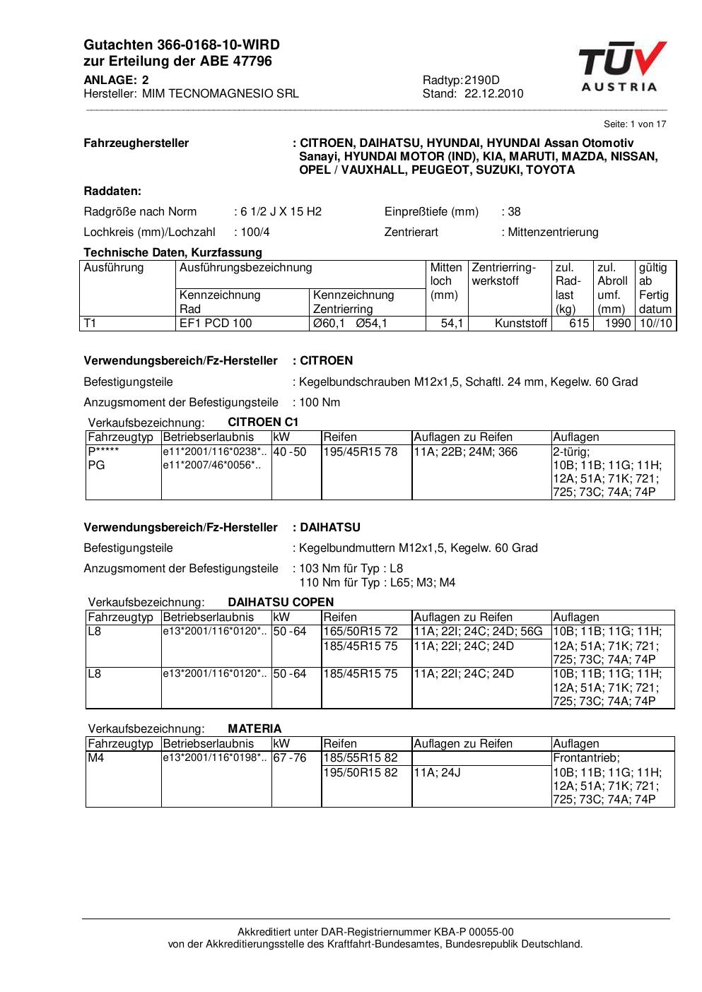 Diese Allgemeine Betriebserlaubnis (ABE) bezieht sich auf die Felge ATS 2190D in der Ausführung 2Jx15 ET0 mit der KBA 47796. Eine ABE ist eine bauartspezifische Genehmigung, die der Hersteller beim Kraftfahrt-Bundesamt (KBA) erwirkt hat. Sie erlaubt die Verwendung der Felge an den im Dokument genannten Fahrzeugen ohne zusätzliche Einzelabnahme, solange sämtliche im Gutachten aufgeführten Auflagen eingehalten werden.