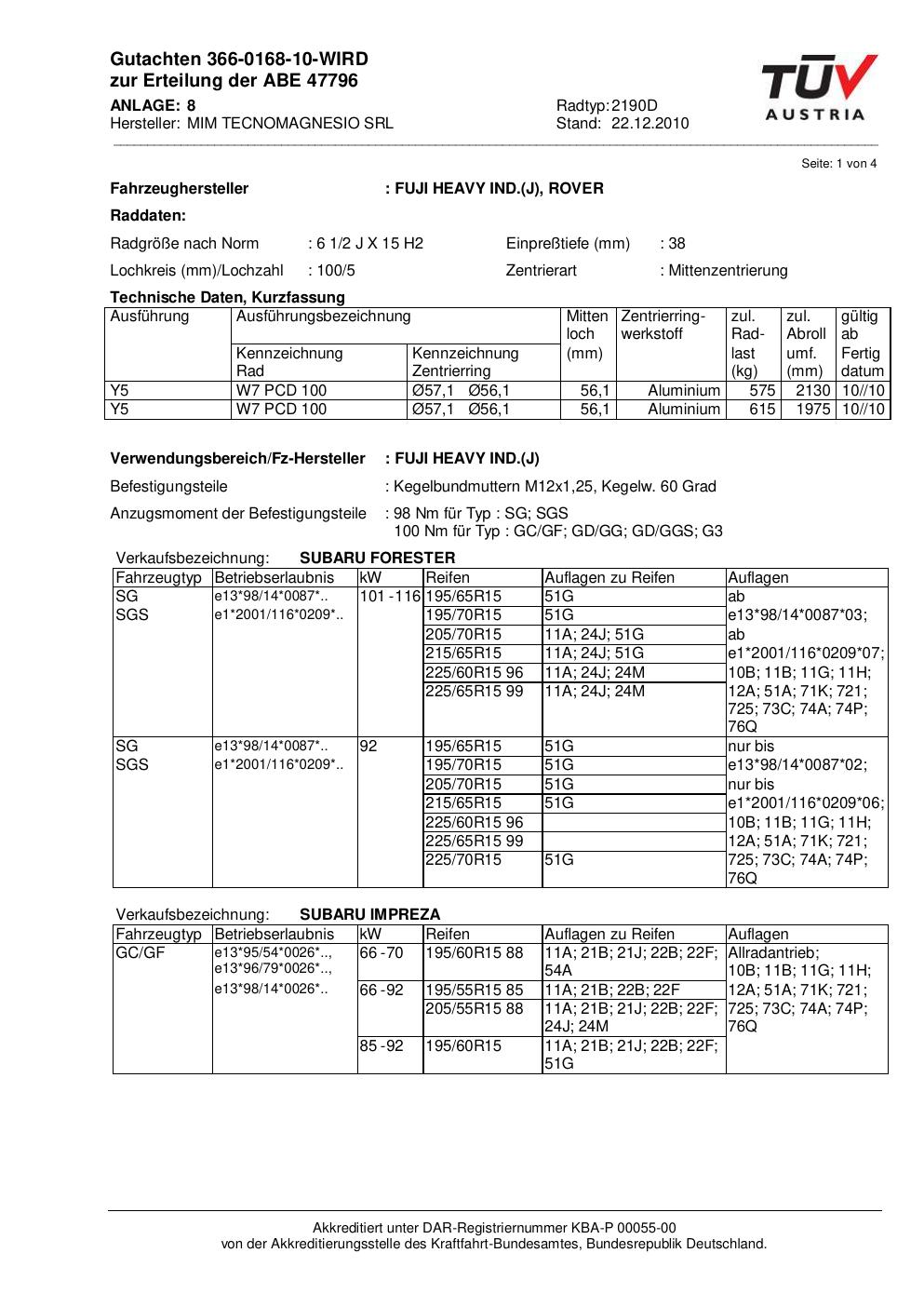Felgengutachten / abe für Alufelgen ATS 2190D (2Jx15 ET 0, Mittenloch 0 mm) mit KBA 47796 (Zertifikatsnummer 47796). Hier kostenlos als PDF herunterladen. Der Download-Link ist 24 Stunden gültig und kann bis zu zwei Mal verwendet werden.