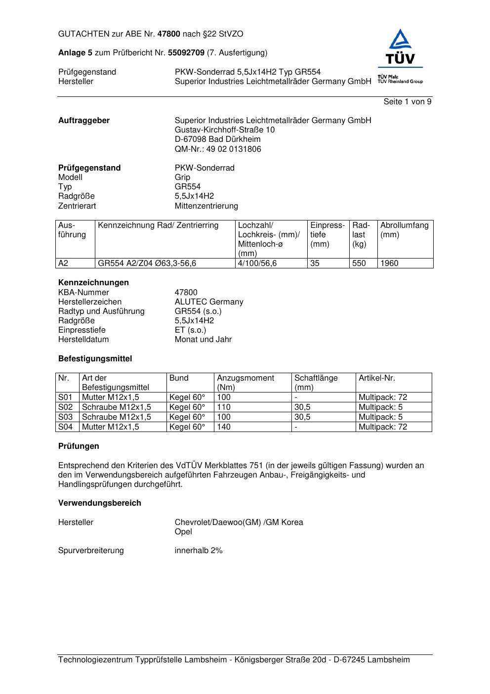 Dieses Gutachten (abe) bezieht sich auf die Alufelge ALUTEC GR554 in der Ausführung 5.5Jx14 ET 0, Mittenloch 0 mm (KBA 47800). Im PDF findest du typischerweise zulässige Reifengrößen, Auflagen/Anbauhinweise und – je nach Dokument – Hinweise zur Eintragung.