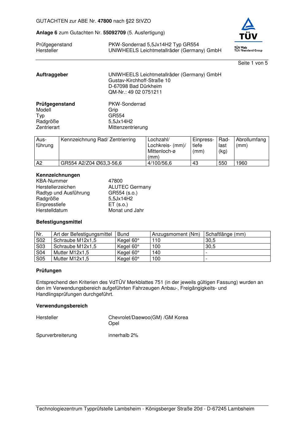 Dieses Gutachten (abe) bezieht sich auf die Alufelge ALUTEC GR554 in der Ausführung 5.5Jx14 ET 0, Mittenloch 0 mm (KBA 47800). Im PDF findest du typischerweise zulässige Reifengrößen, Auflagen/Anbauhinweise und – je nach Dokument – Hinweise zur Eintragung.