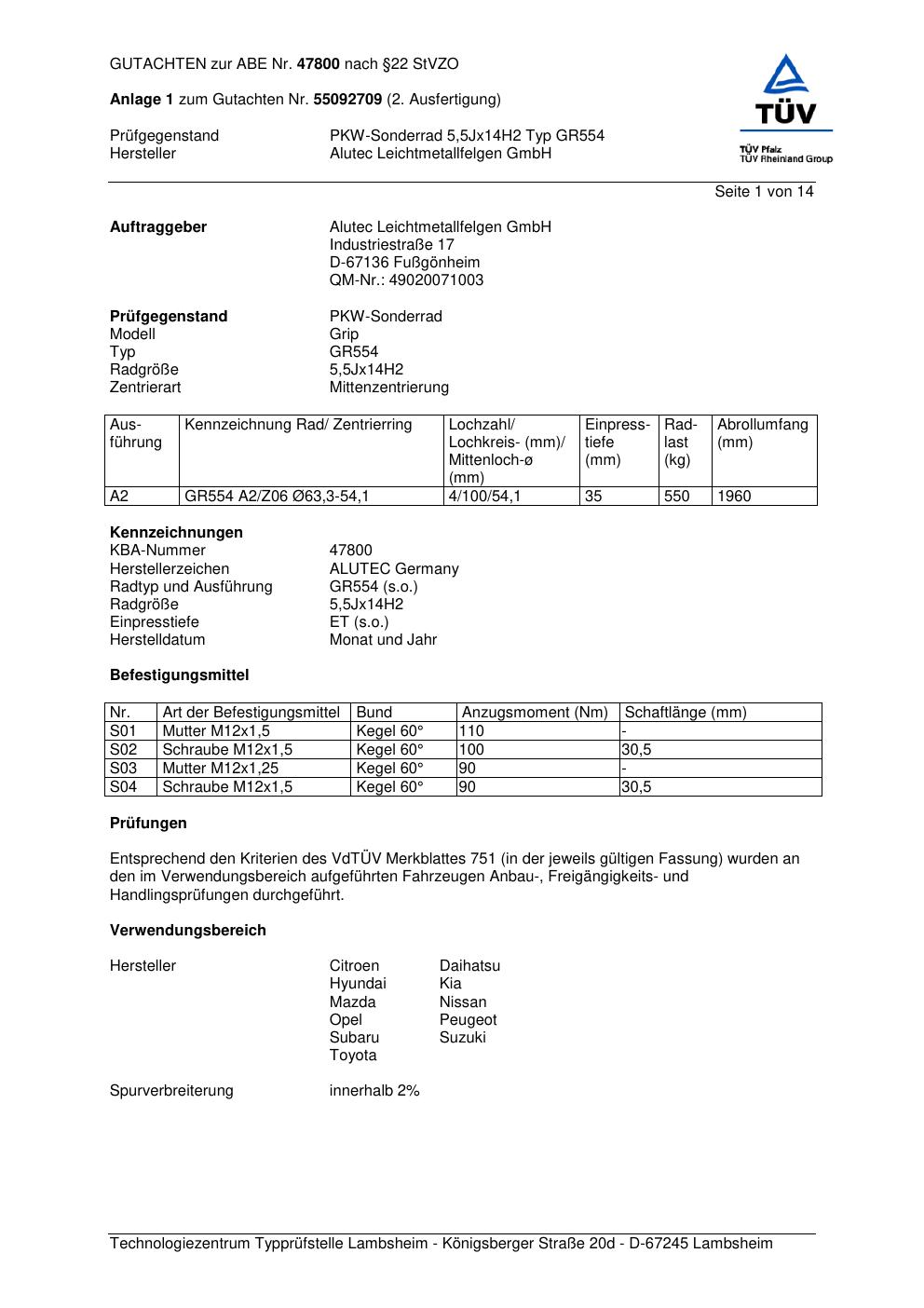 Dieses Gutachten (abe) bezieht sich auf die Alufelge ALUTEC GR554 in der Ausführung 5.5Jx14 ET 0, Mittenloch 0 mm (KBA 47800). Im PDF findest du typischerweise zulässige Reifengrößen, Auflagen/Anbauhinweise und – je nach Dokument – Hinweise zur Eintragung.